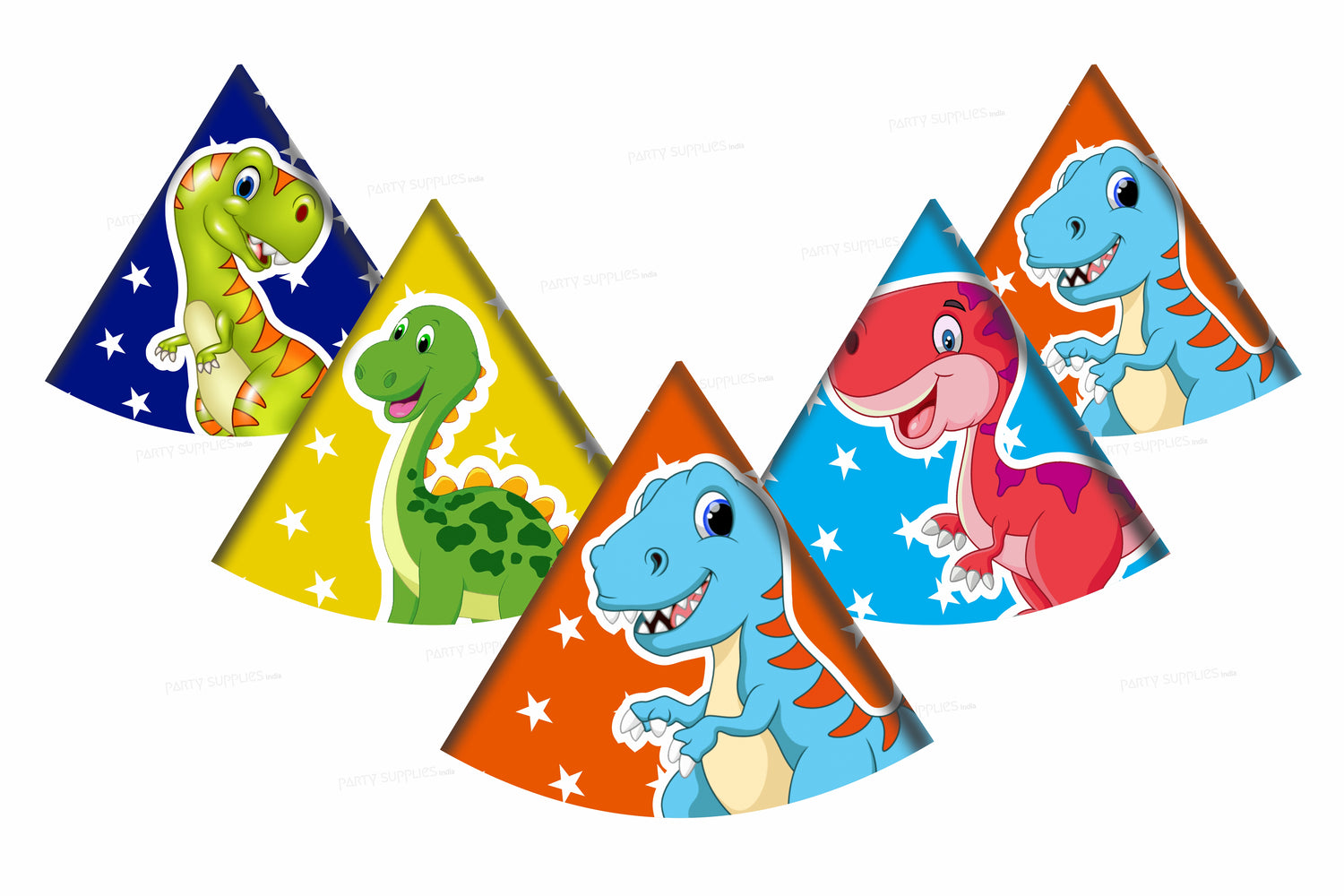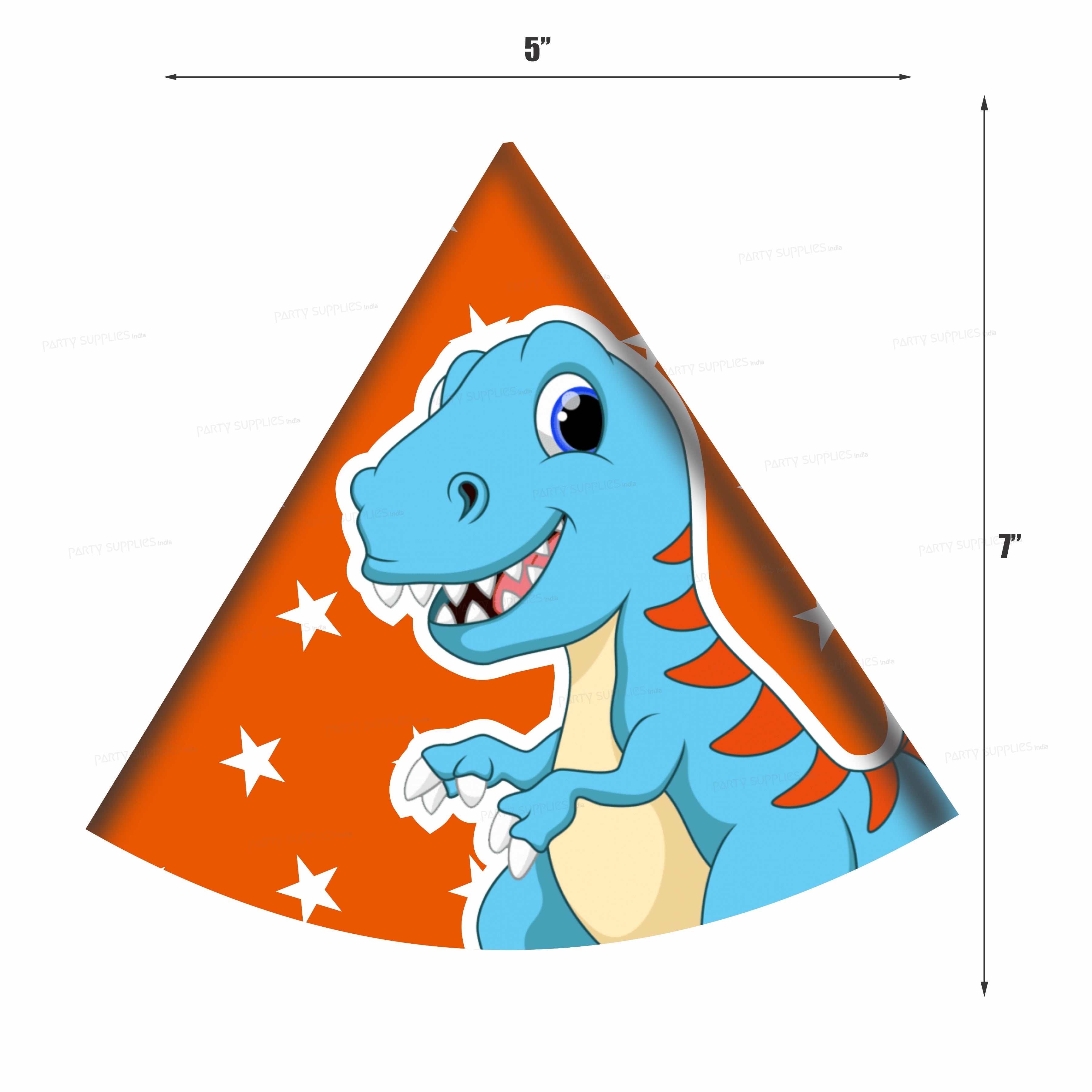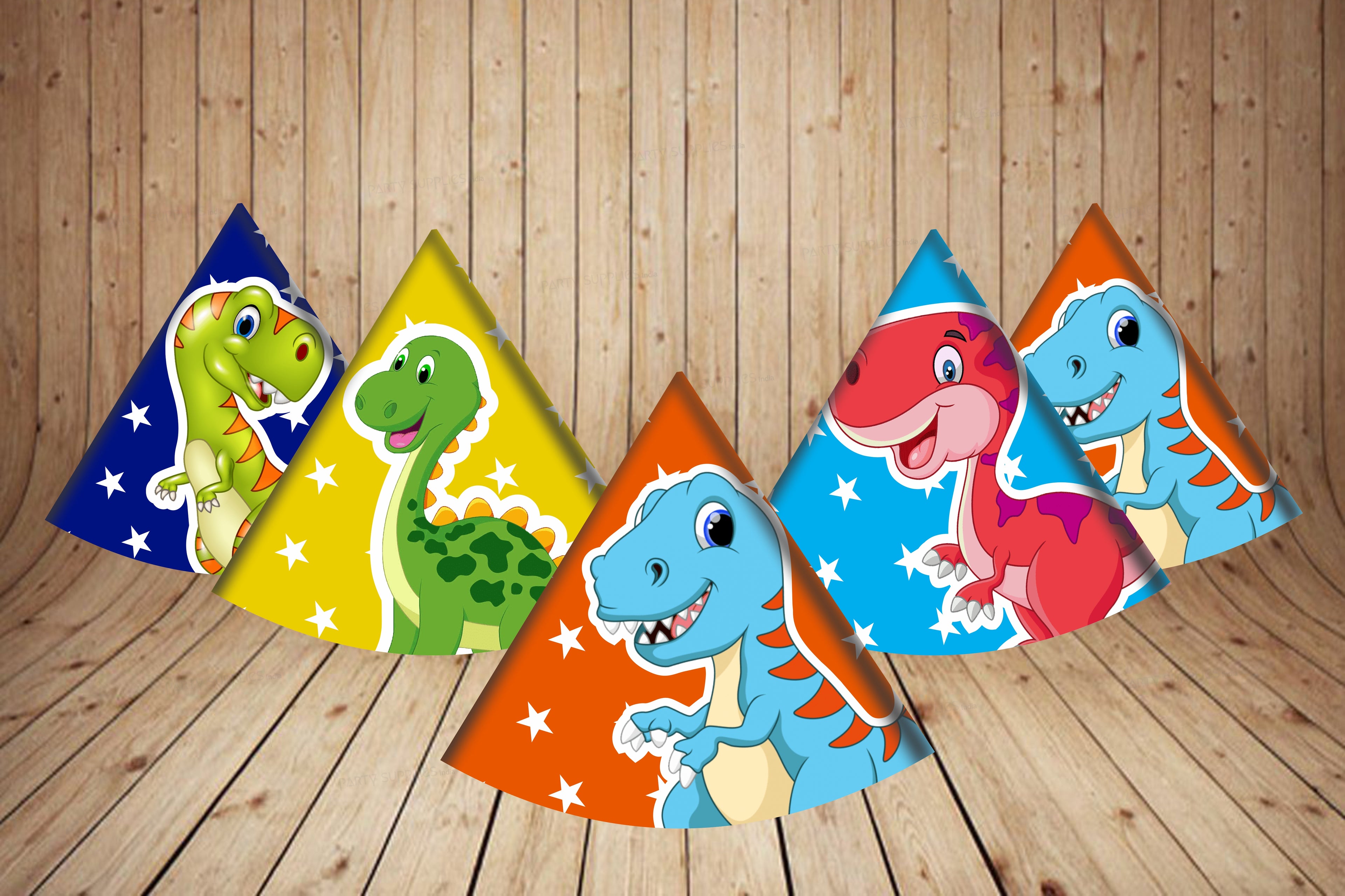 Our pack of 5 Dino Themed Hats are a great addition to use with our Dino Themed decor. With a Triceratops or Tyrannosaurus Rex in a Polka design these cone hats are the finishing touch to your children's Dinosaur party.