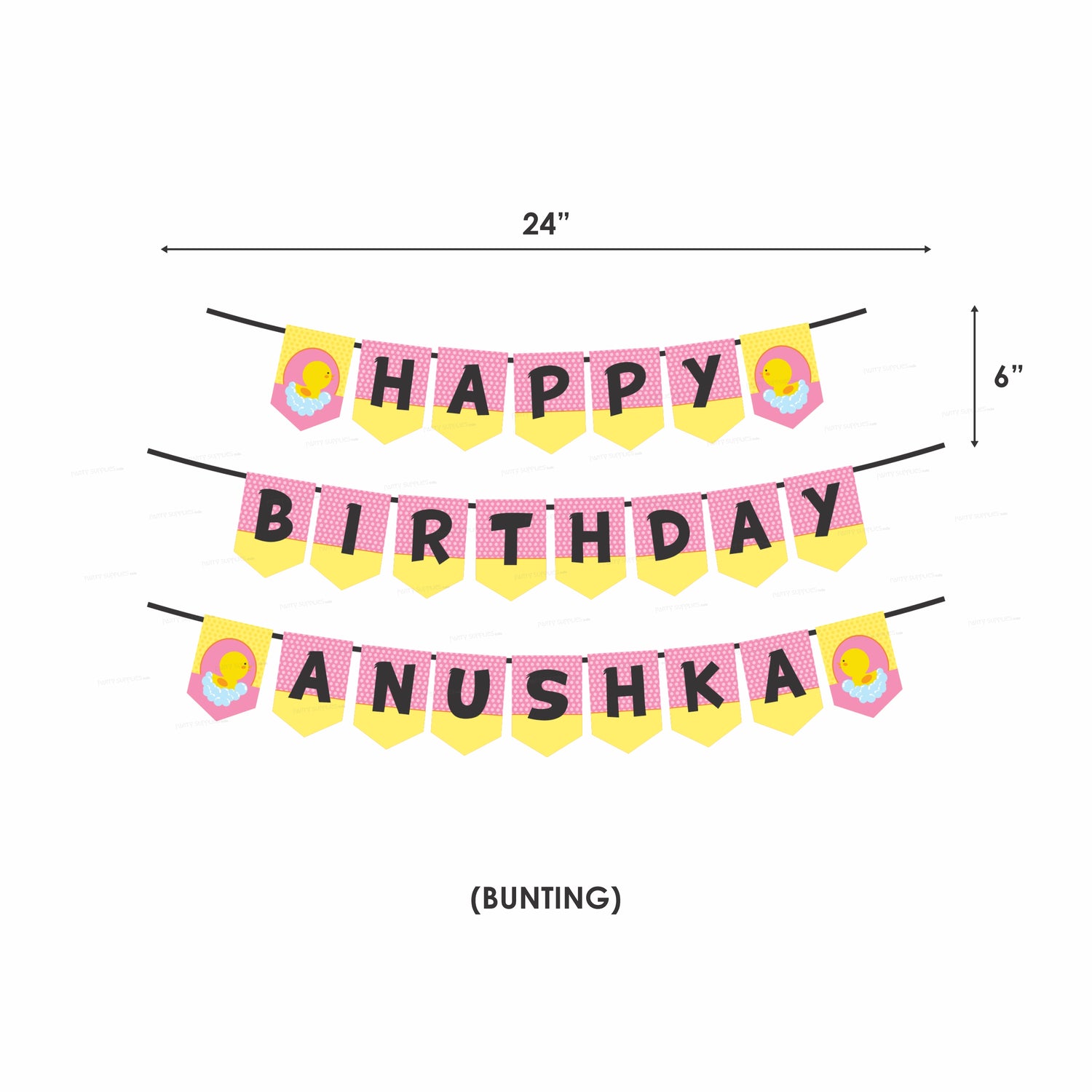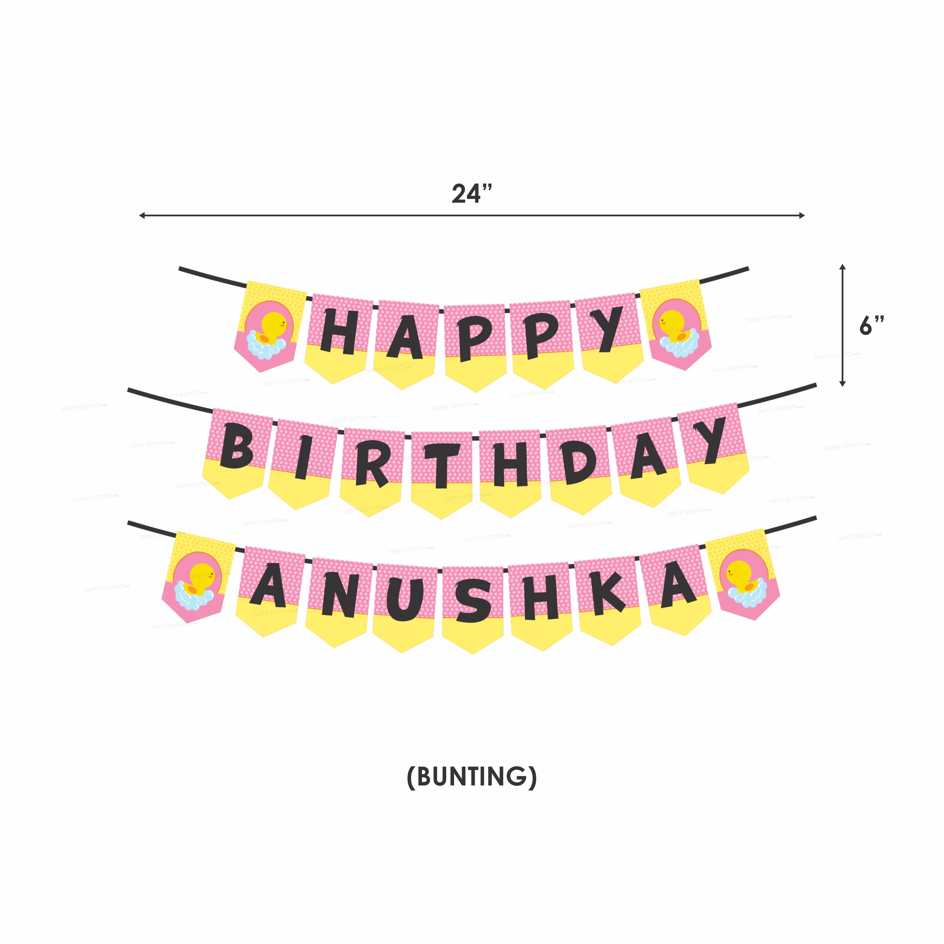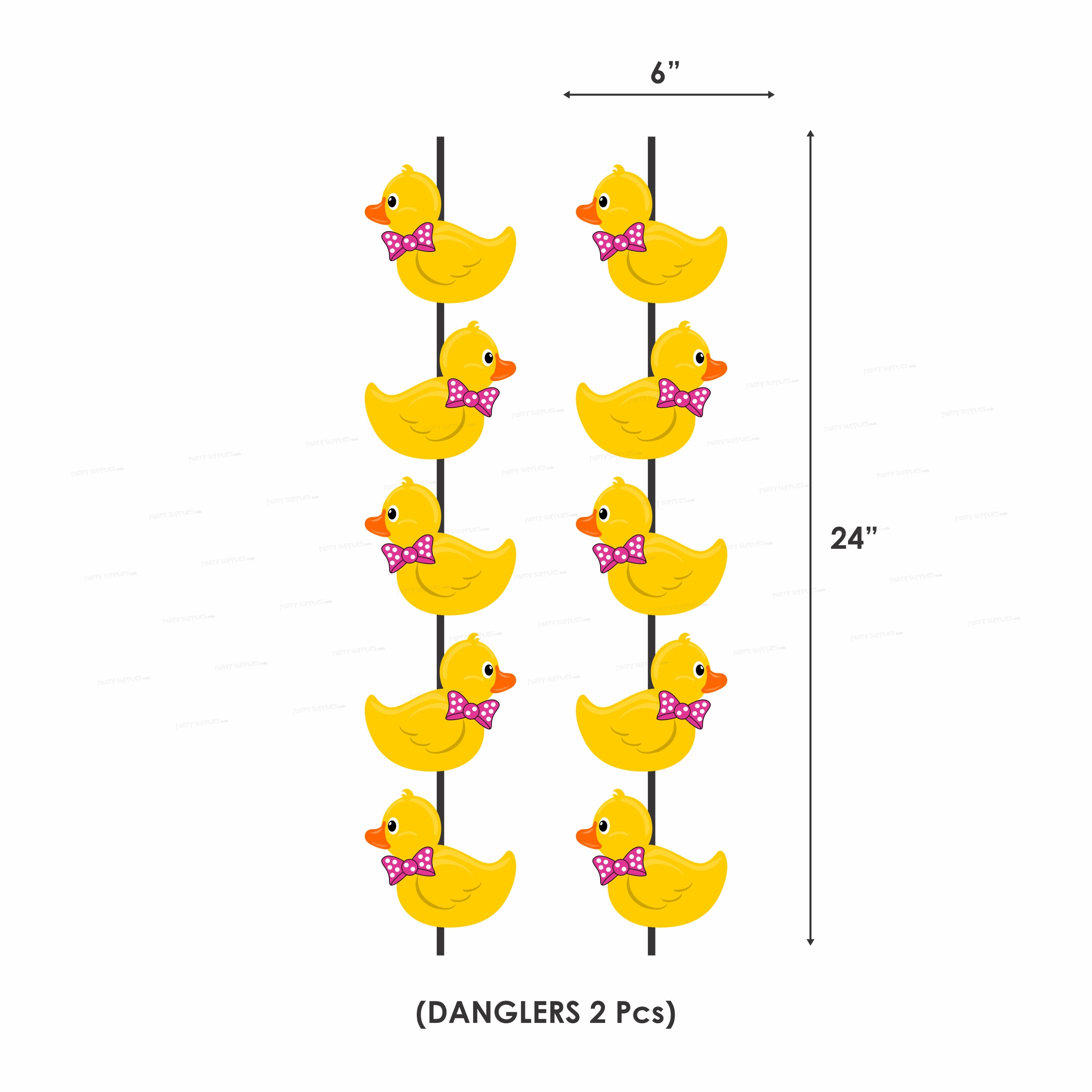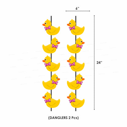 With their bright color, smooth texture, and (for some) squeaky or quacky sounds, rubber ducks sharpen toddlers' senses. Their presence in the bathtub soothes youngsters' fears of water and water immersion and makes good clean fun of the routine hygiene they are learning. Most toddlers become friends with their Ducky ducks.This casual Duck themed party decor will bring out memories of adults and grown up kids. Basic Kit is Available for Duck Girl Theme.