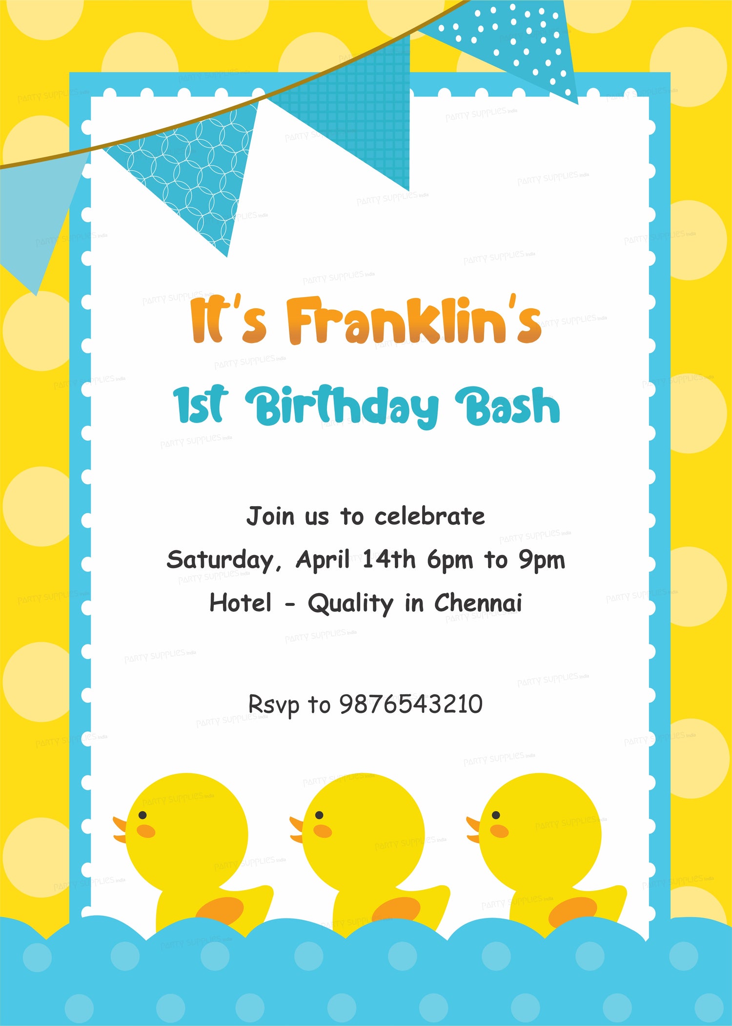Our Ducky Duck birthday party personalized invitations feature an adorable yellow duckling against a vibrant background of blue bubbles. Perfect for boys these invitations are printed on premium-grade paper .Turn your “pond” into a festive party with our one-of-a-kind Ducky Duck birthday party invitations. Since the invite is customized and printed in-house we do not provide envelop.