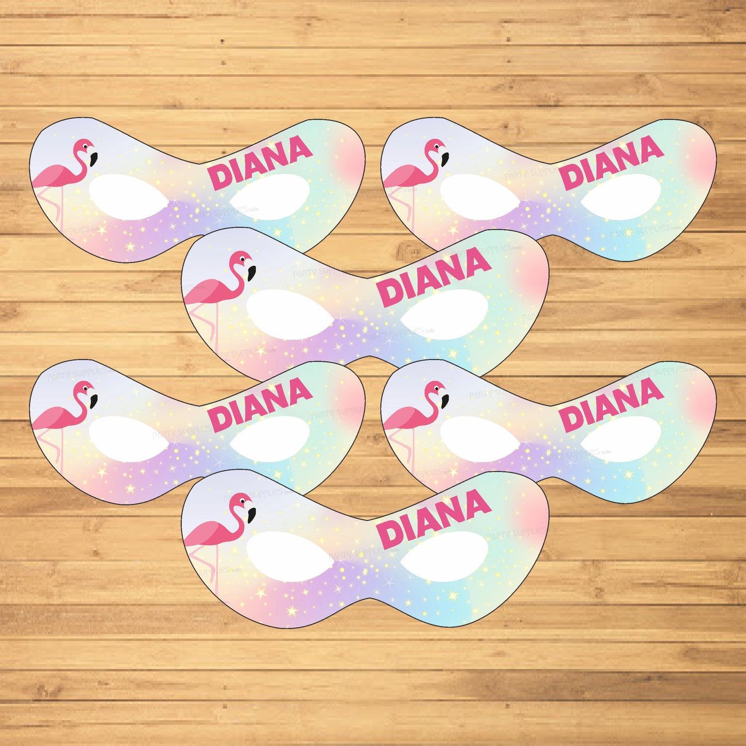 Highlight your look with our dazzling mask. Place these masks in khoi bags for kids or lay out on your party table for a fun look! Package includes 6 Masks, each with an attached elastic string and cutout holes for eyes.