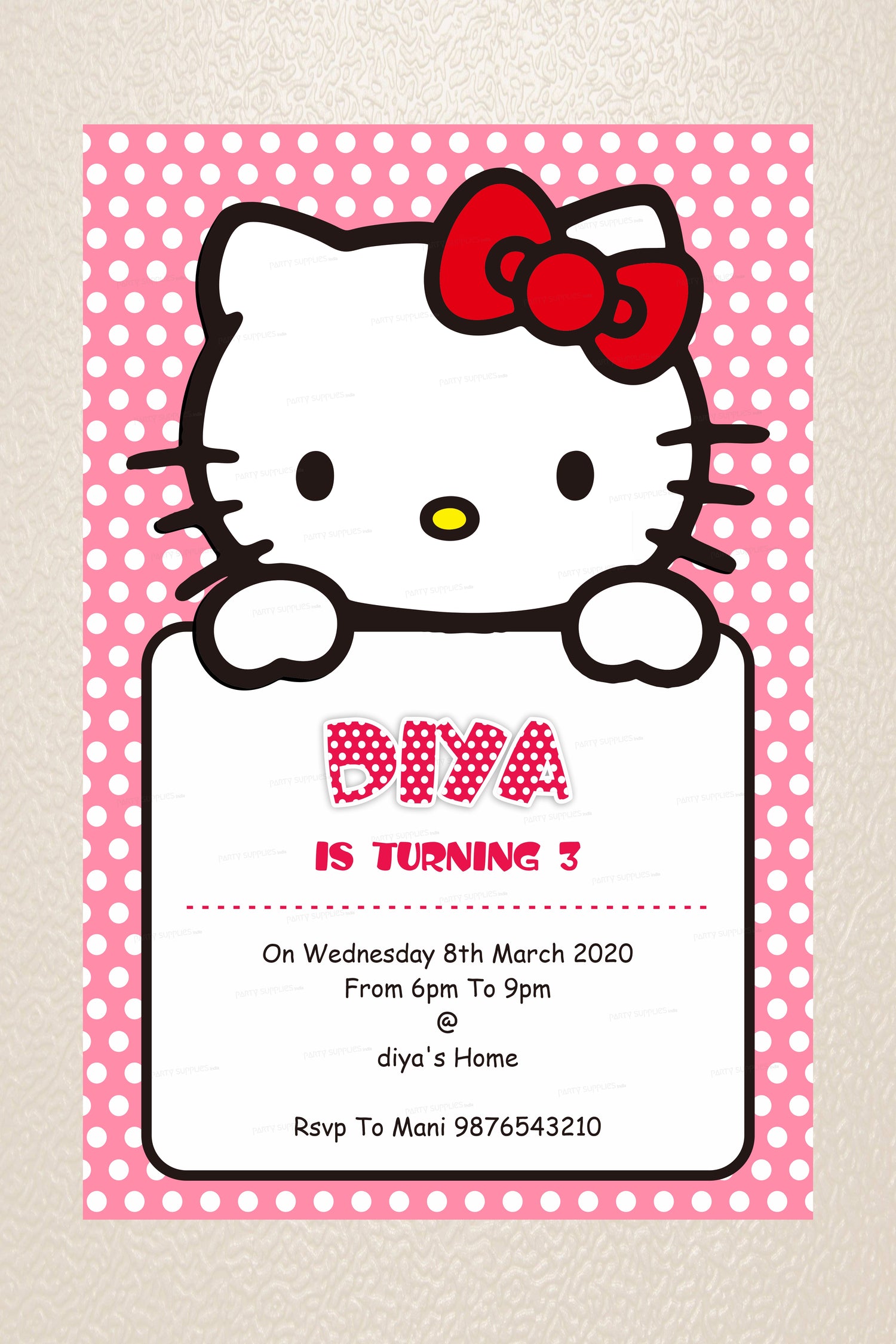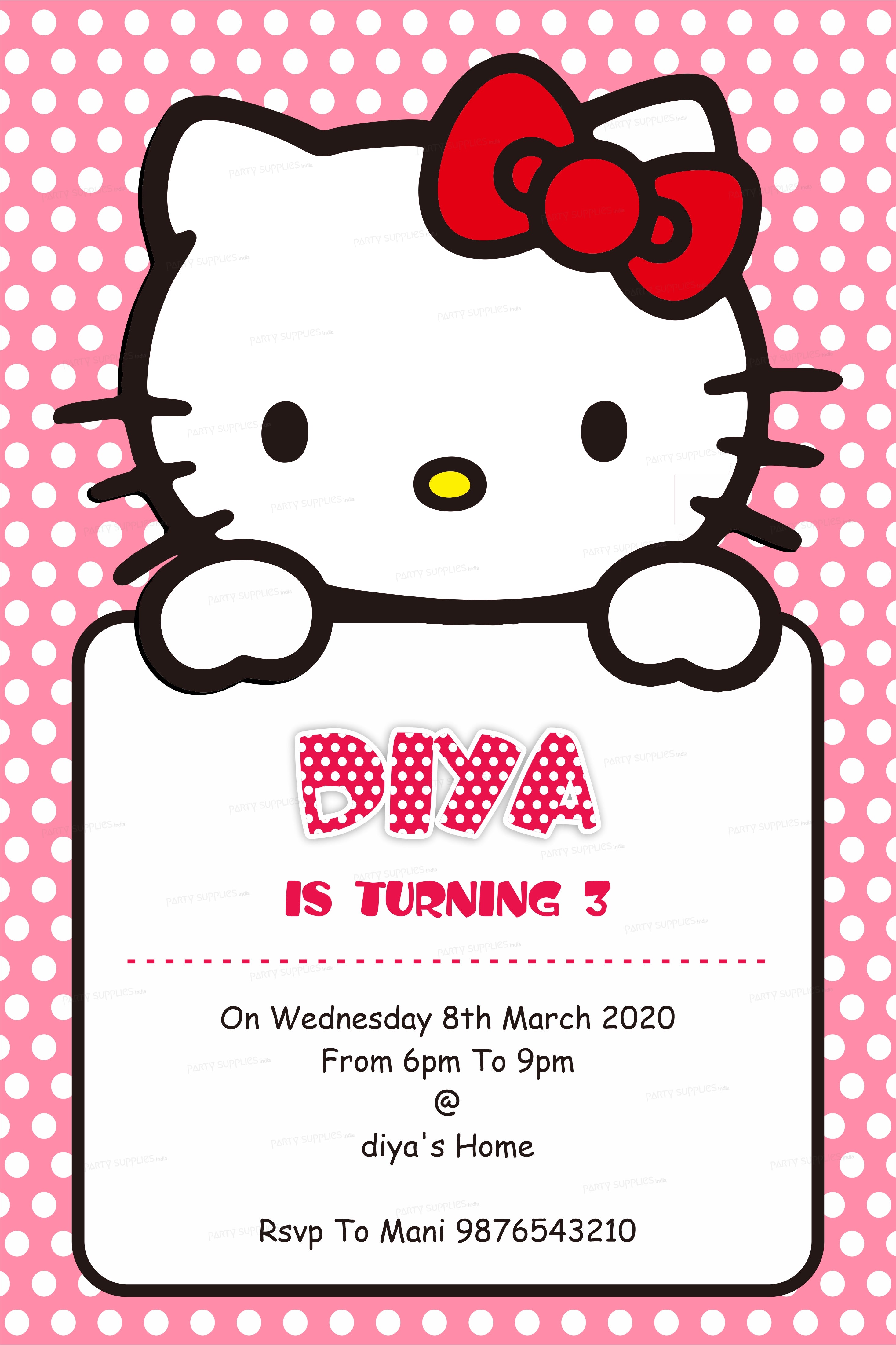 Calling all birthday girls, this Hello Kitty birthday party invitation is for you! Let Kitty White help you celebrate in style with this colorful Hello Kitty birthday party invitation featuring a pretty pink background and a rainbow of hearts, stars and flower graphics. It's easy to customize your message, and you can even change the font or text color! Since the invite is customized and printed in-house we do not provide envelop.