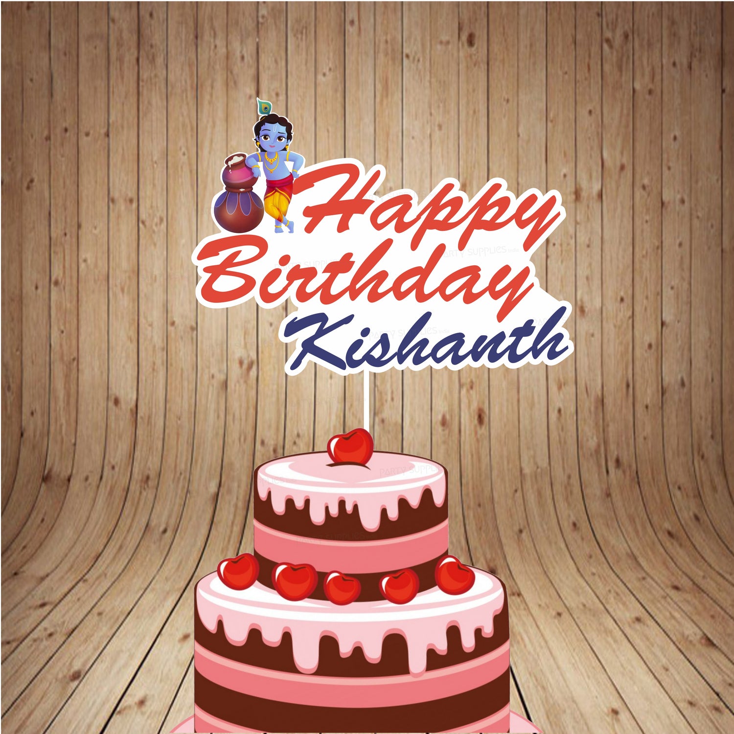 This vivid cake topper with Little Krishna and his favourite butter pot , can be personalised with your kid's name too.
