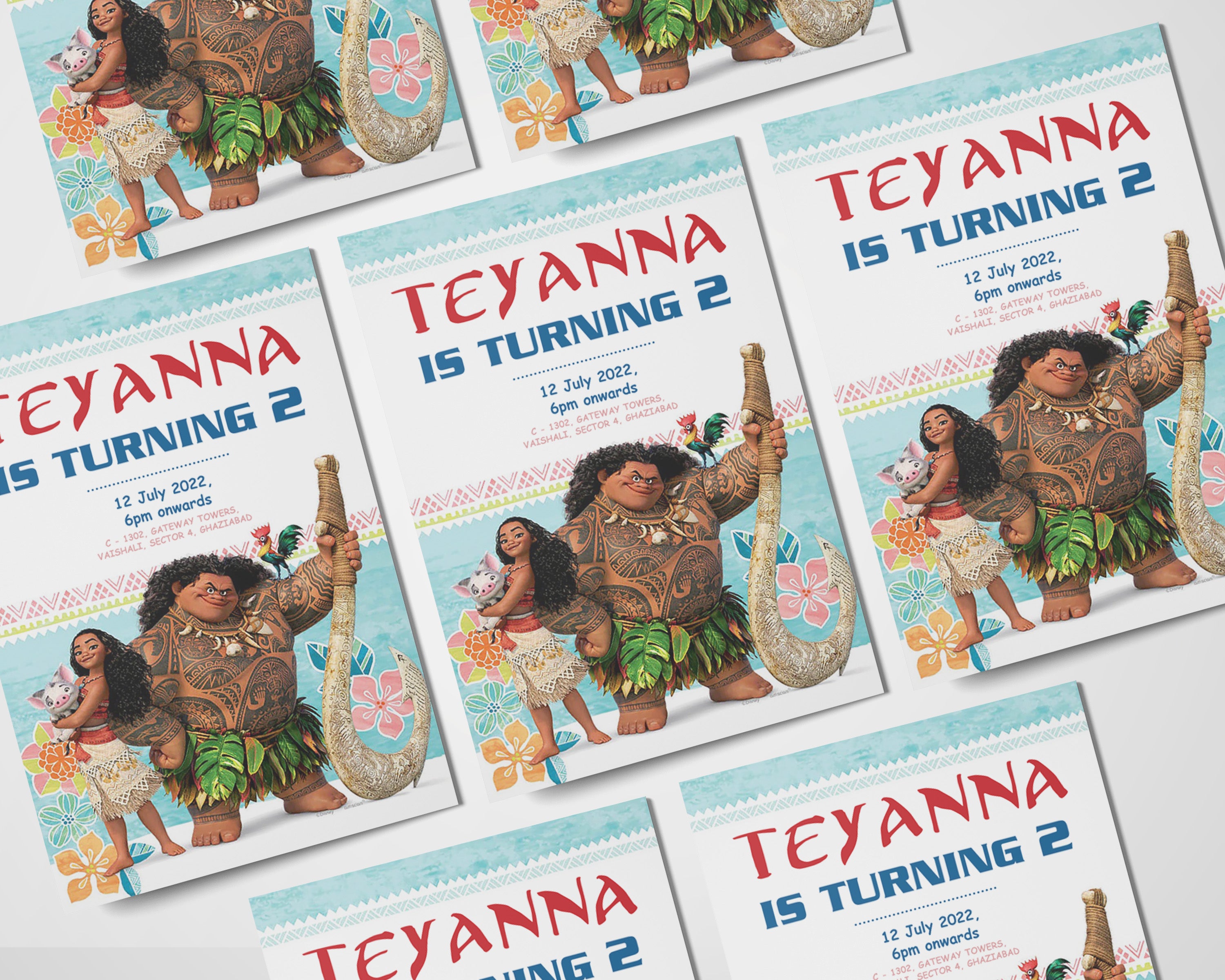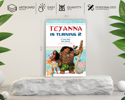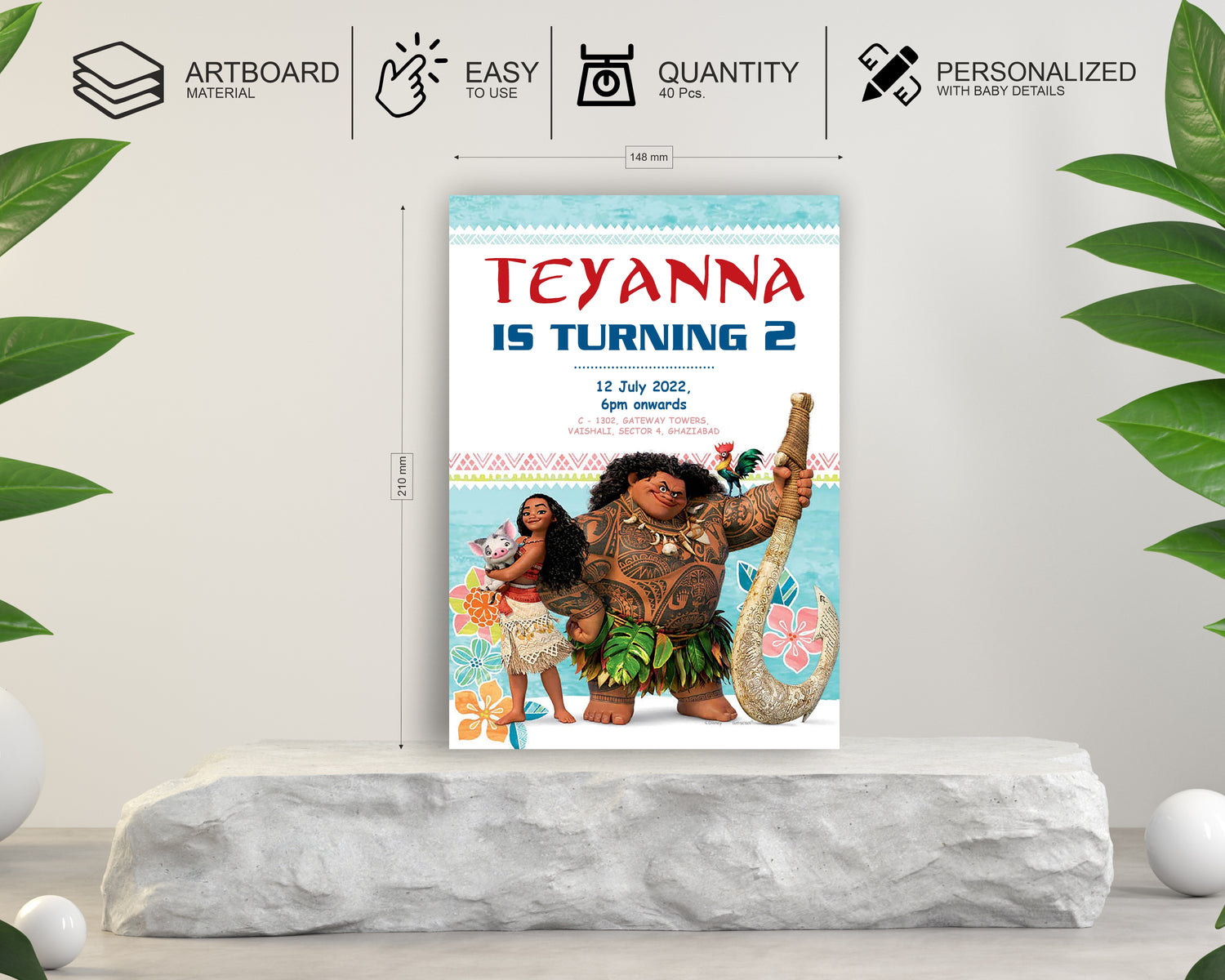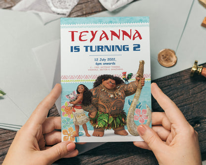 Set sail for an awesome party with a Moana invite! This invite features a print of Moana and Maui surrounded by tribal drawings of flowers. Bring the legendary oceanic adventures from the movie right into your home! Since the invite is customized and printed in-house we do not provide envelop.