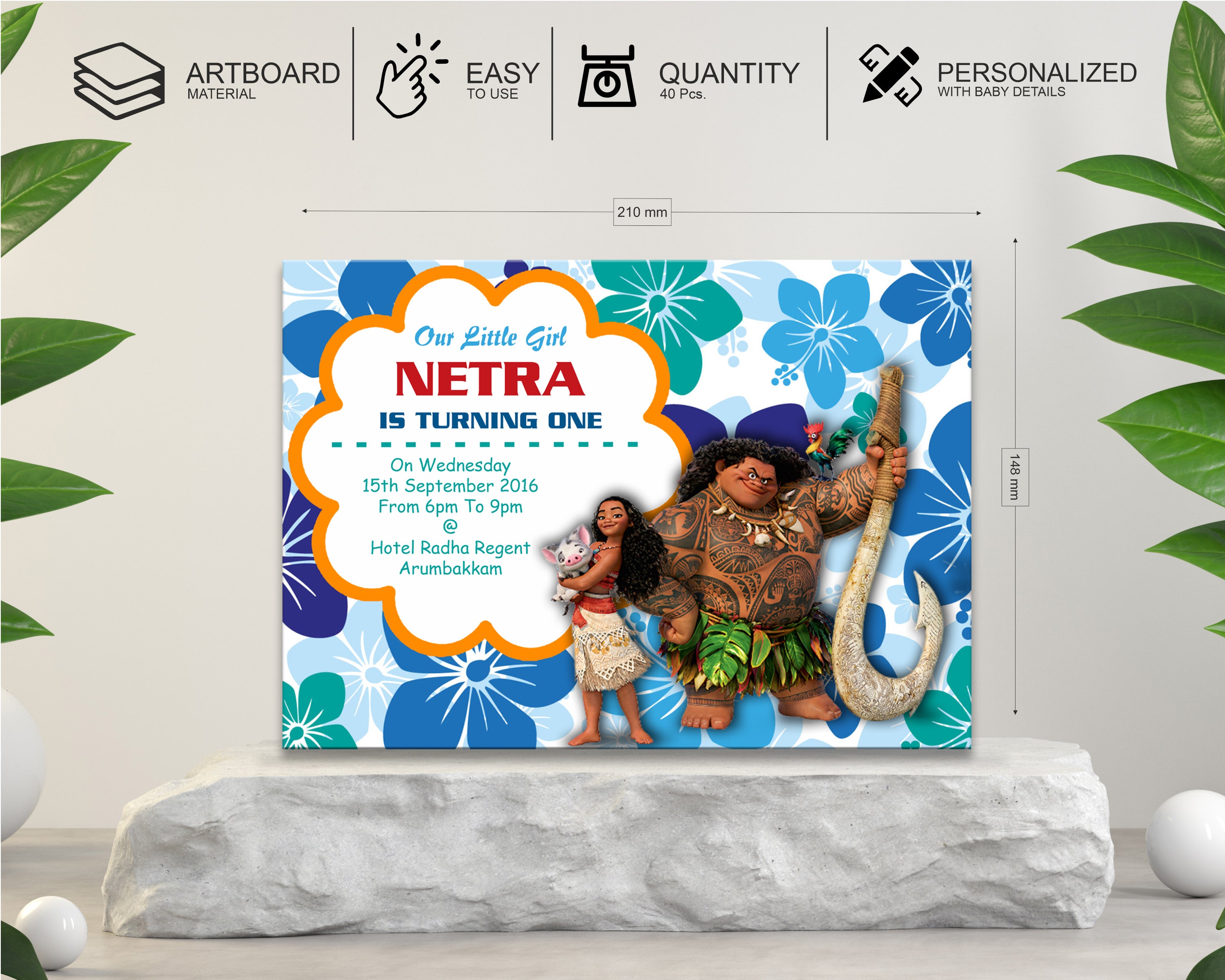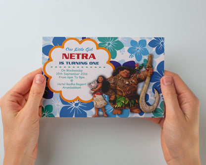 Set sail for an awesome party with a Moana invite! This invite features a print of Moana and Maui surrounded by tribal drawings of flowers. Bring the legendary oceanic adventures from the movie right into your home! Since the invite is customized and printed in-house we do not provide envelop.
