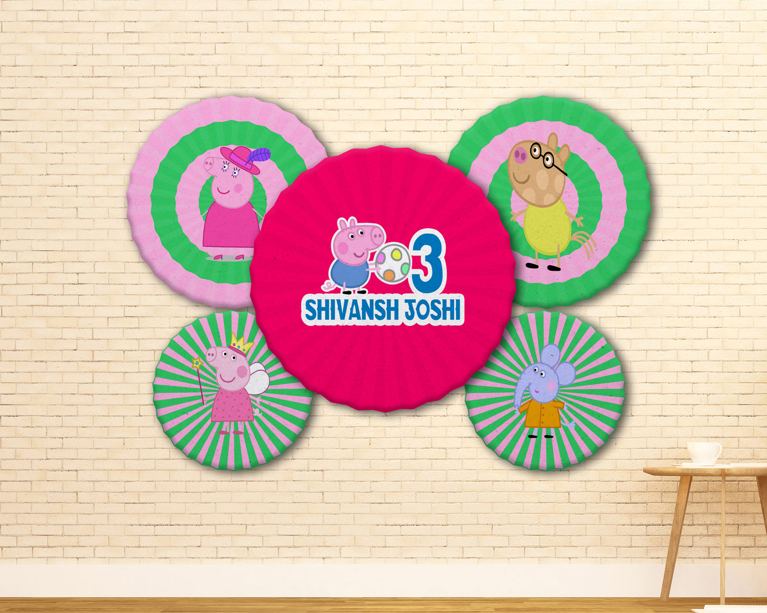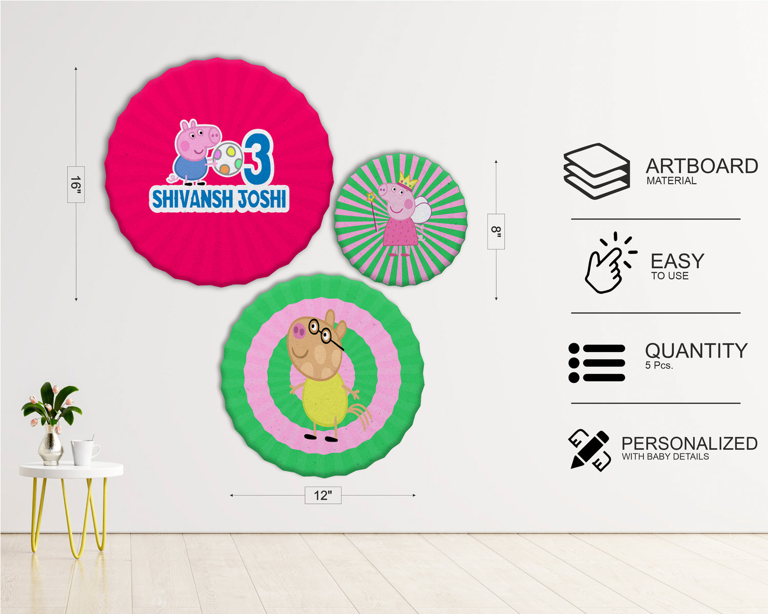 Peppa Pig Boy Paper Fan with related characters placed at the centre which is mainly used for Birthday Party Decorations and made of quality chart material.