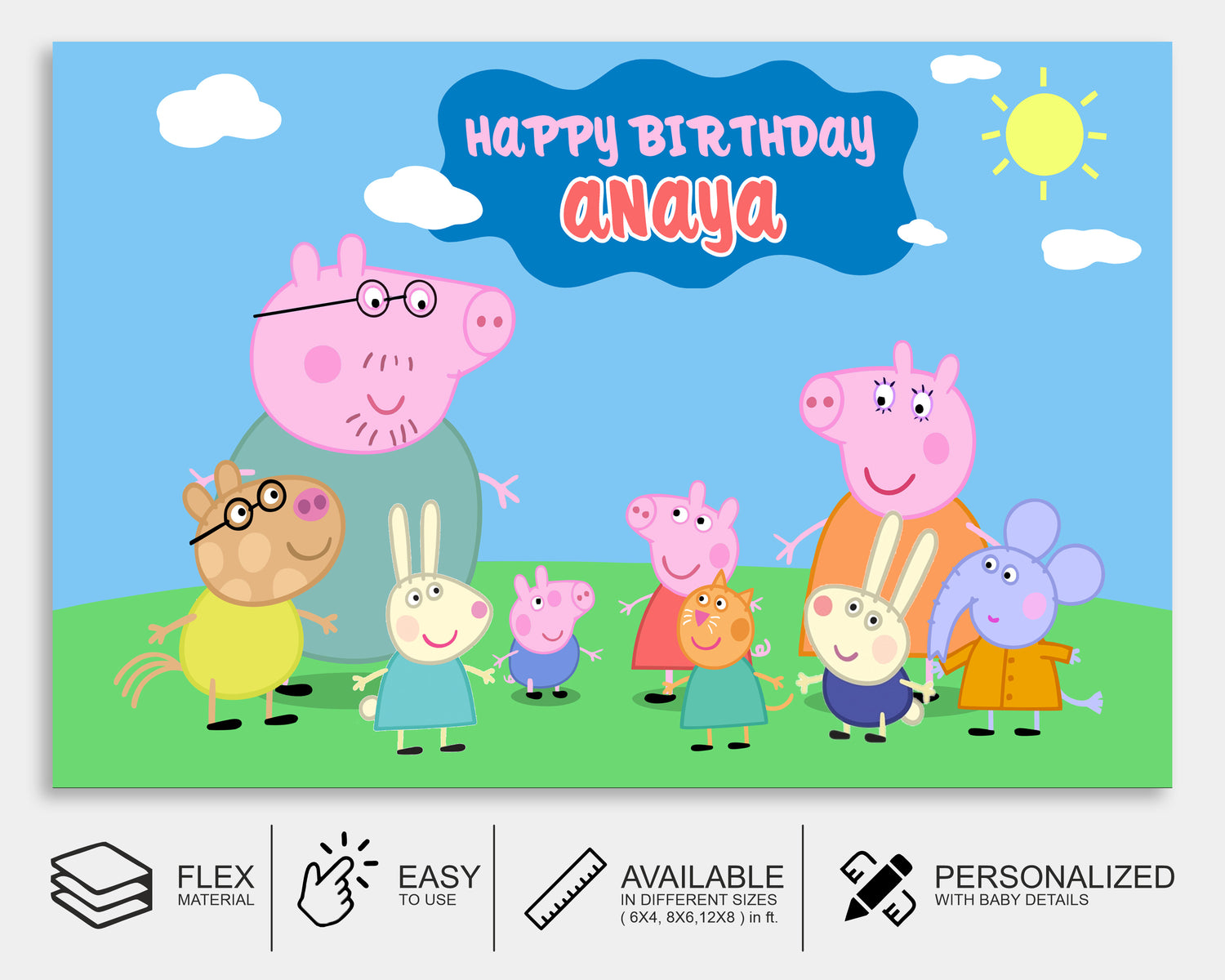 Peppa, an outgoing preschool pig, participates in many energetic activities. She learns something new every day and has a lot of fun with her family and friends. Its great to have a backdrop with most of the characters from the famous show that kids love. Personalize it with the kid's name too.