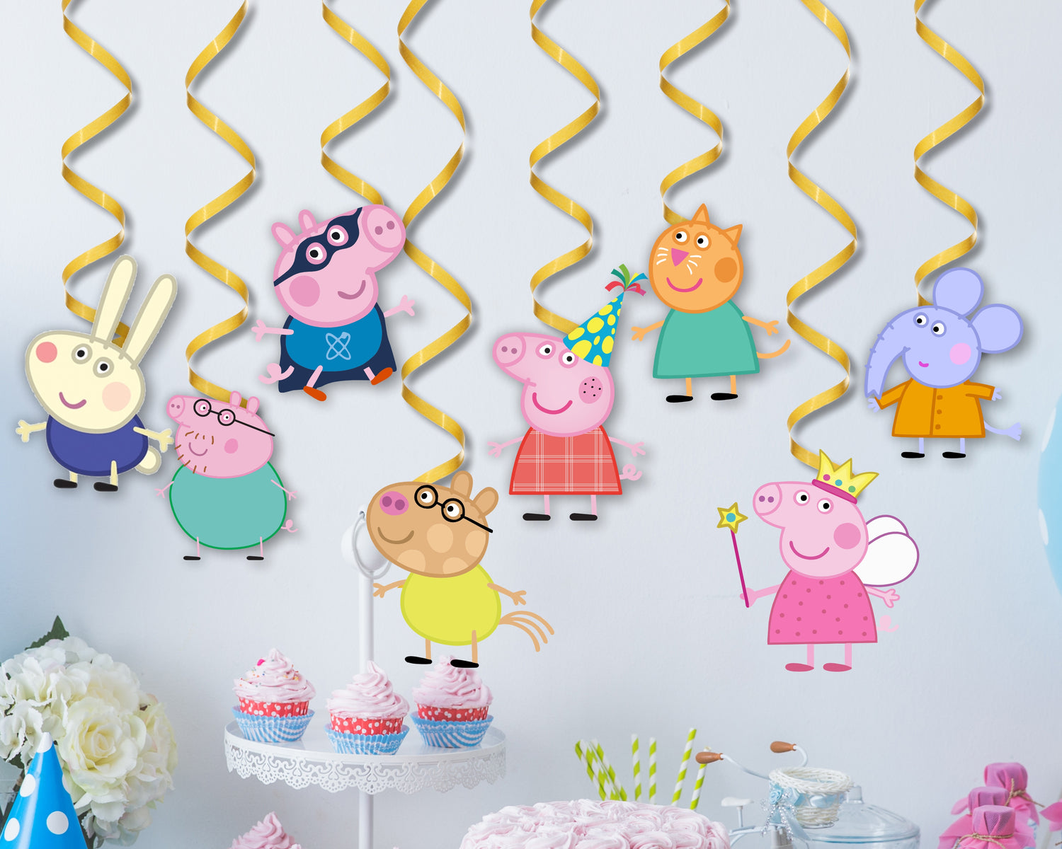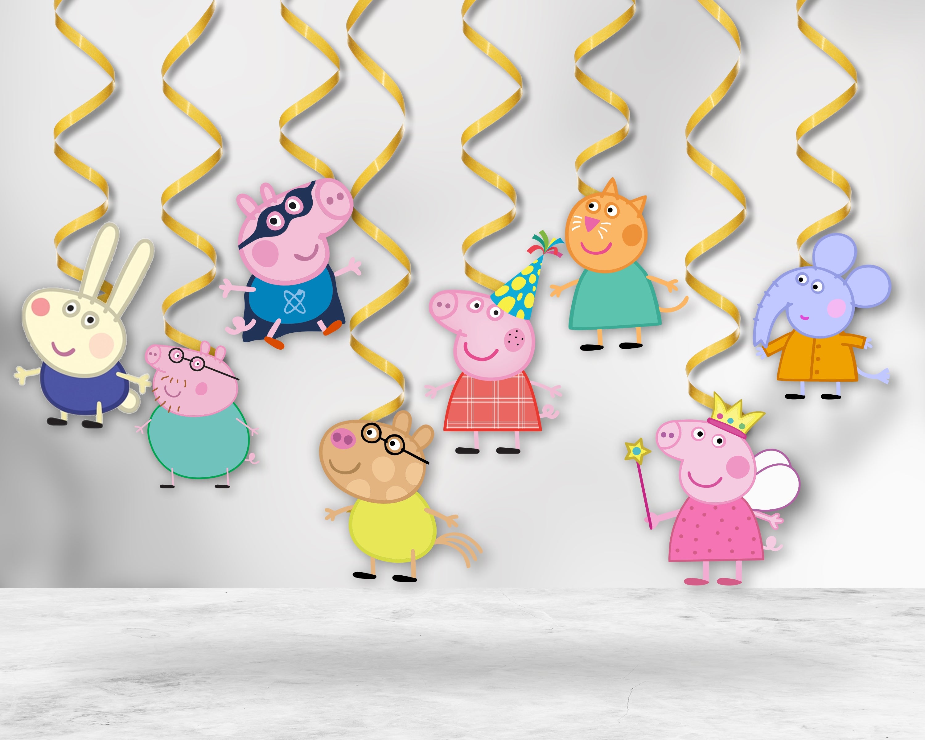 Complete the festive look for your Peppa Pig party with swirl decorations! These card stock hanging spirals feature Peppa, George, Suzy Sheep, and Rebecca Rabbit on a background of confetti and balloons. Hang these swirls from the ceiling to complete the rest of your little one's Peppa Pig-themed birthday!