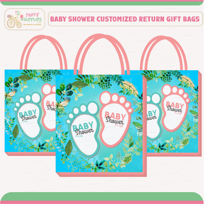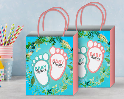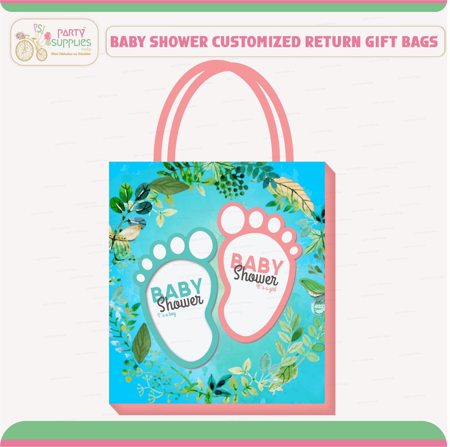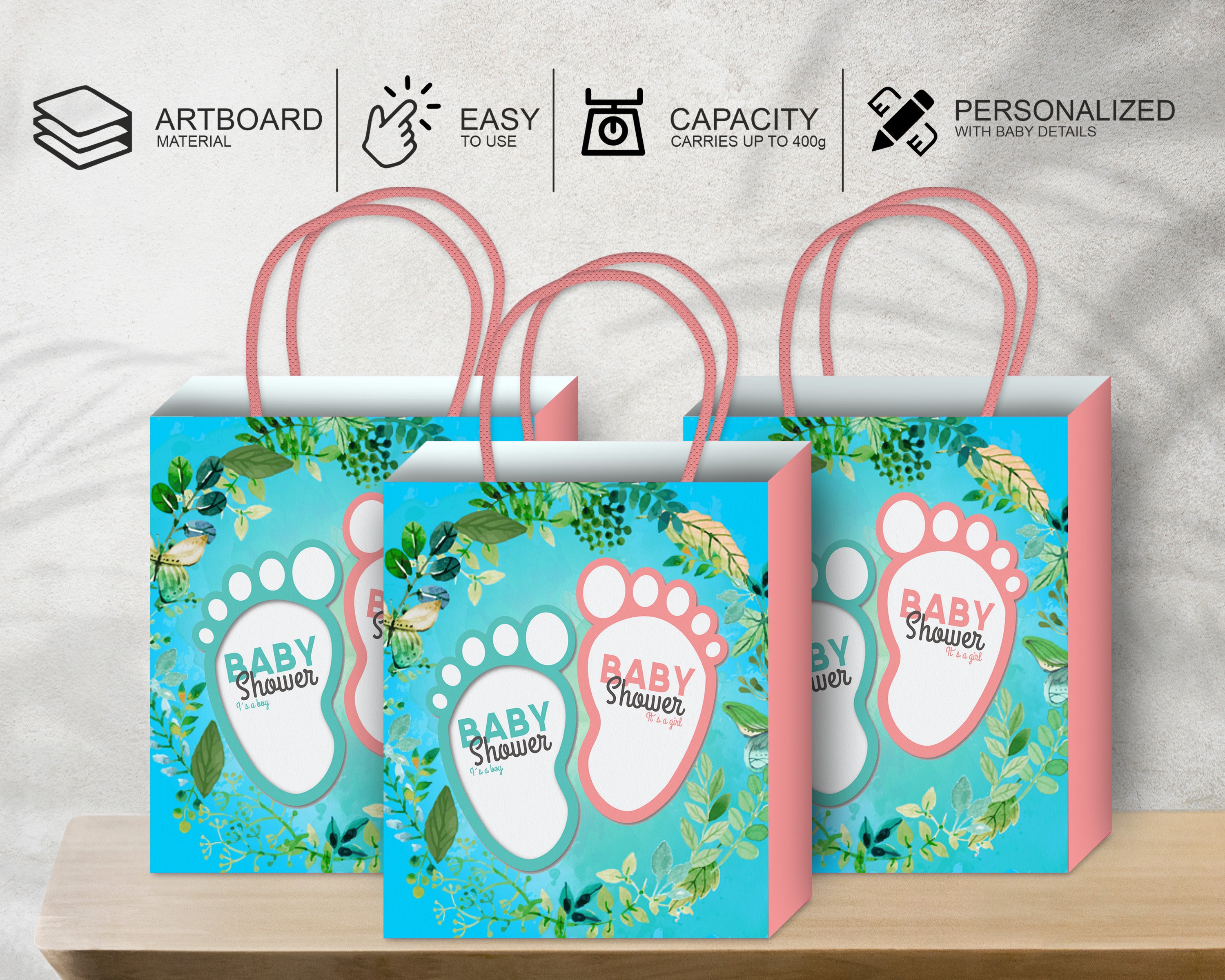 Colorful and Baby Shower theme based return gift bag personalized with baby name for take away gifts for guests. Made of 225 GSM quality Art board material and it can withstand upto 400g to 600g of weight also will have satin ribbon at the top to hold it (Colour of satin ribbon will be based on availability).
