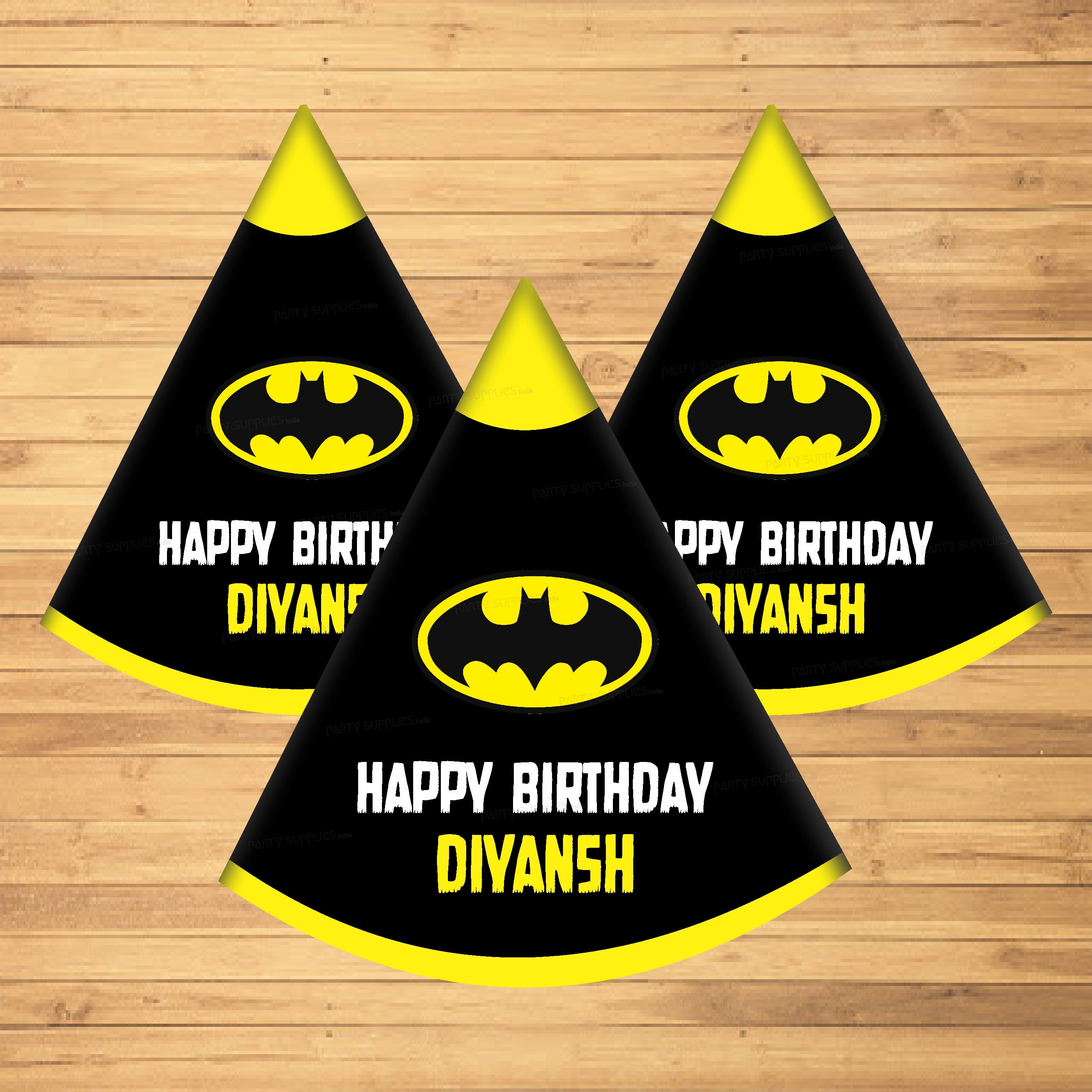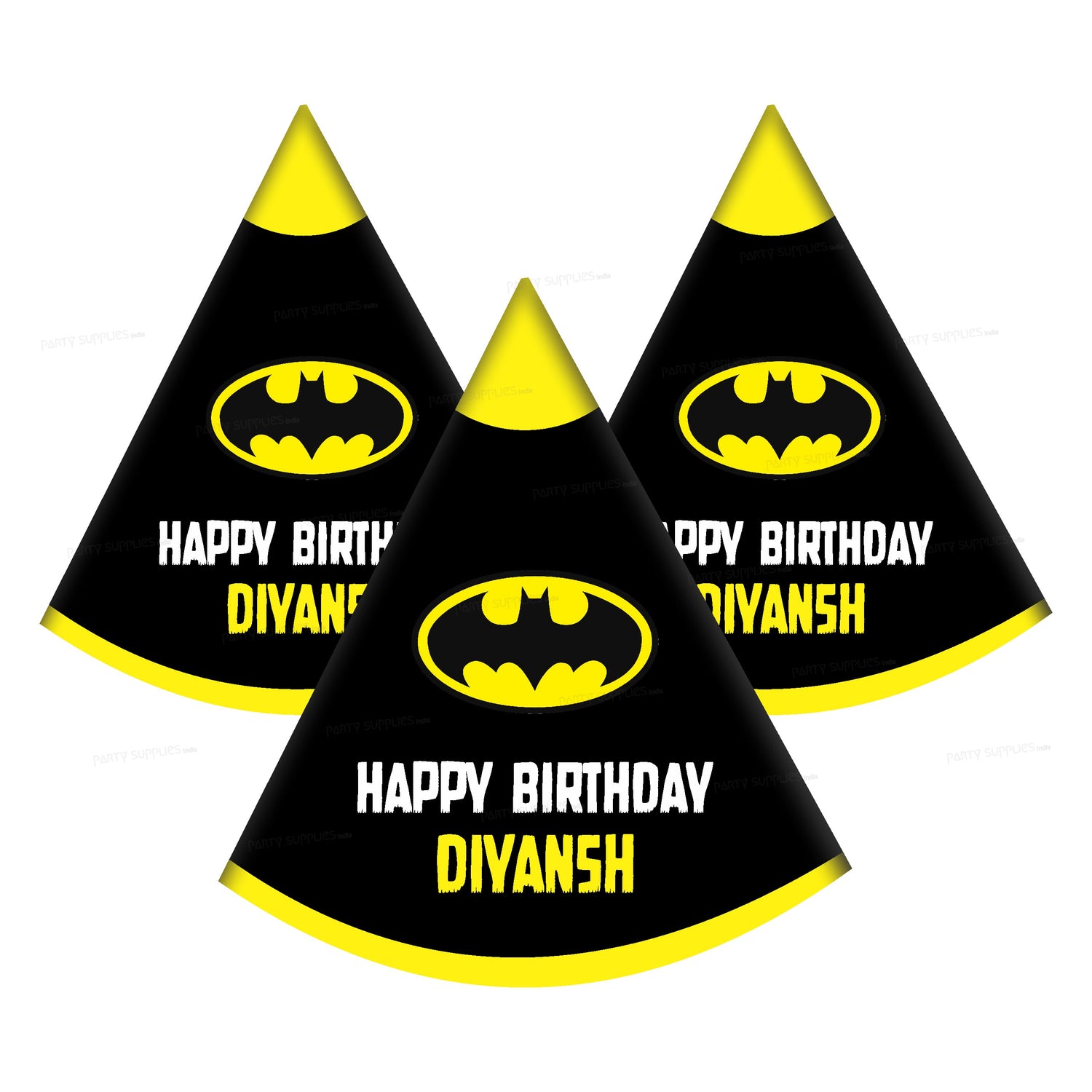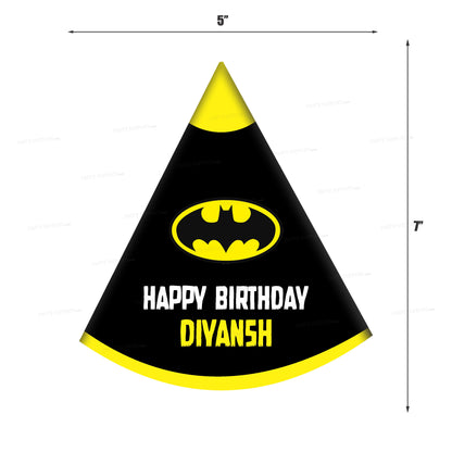 Pack of 5 Batman Party Hats from the Heroes range. Party Hats are cone-shaped and made of cardboard with an elastic cord to help secure them.Cone party hats each feature an image of Batman with the kid's name.Hand out to guests for them to wear, display on your party table as a party decoration, or use as a party favour to fill a party bag.