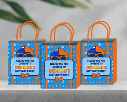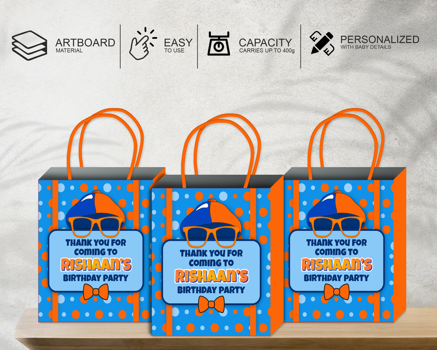 Colorful and Blippi theme based return gift bag personalized with baby name for take away gifts for guests. Made of 225 GSM quality Art board material and it can withstand upto 400g to 600g of weight also will have satin ribbon at the top to hold it (Colour of satin ribbon will be based on availability).