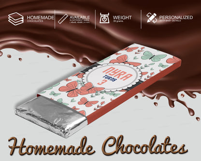 The chocolates are sourced from the finest homemade chocolate makers, and the wrappers are personalized with the baby's name by us, adding a special touch to these sweet treats. Your guests will love receiving