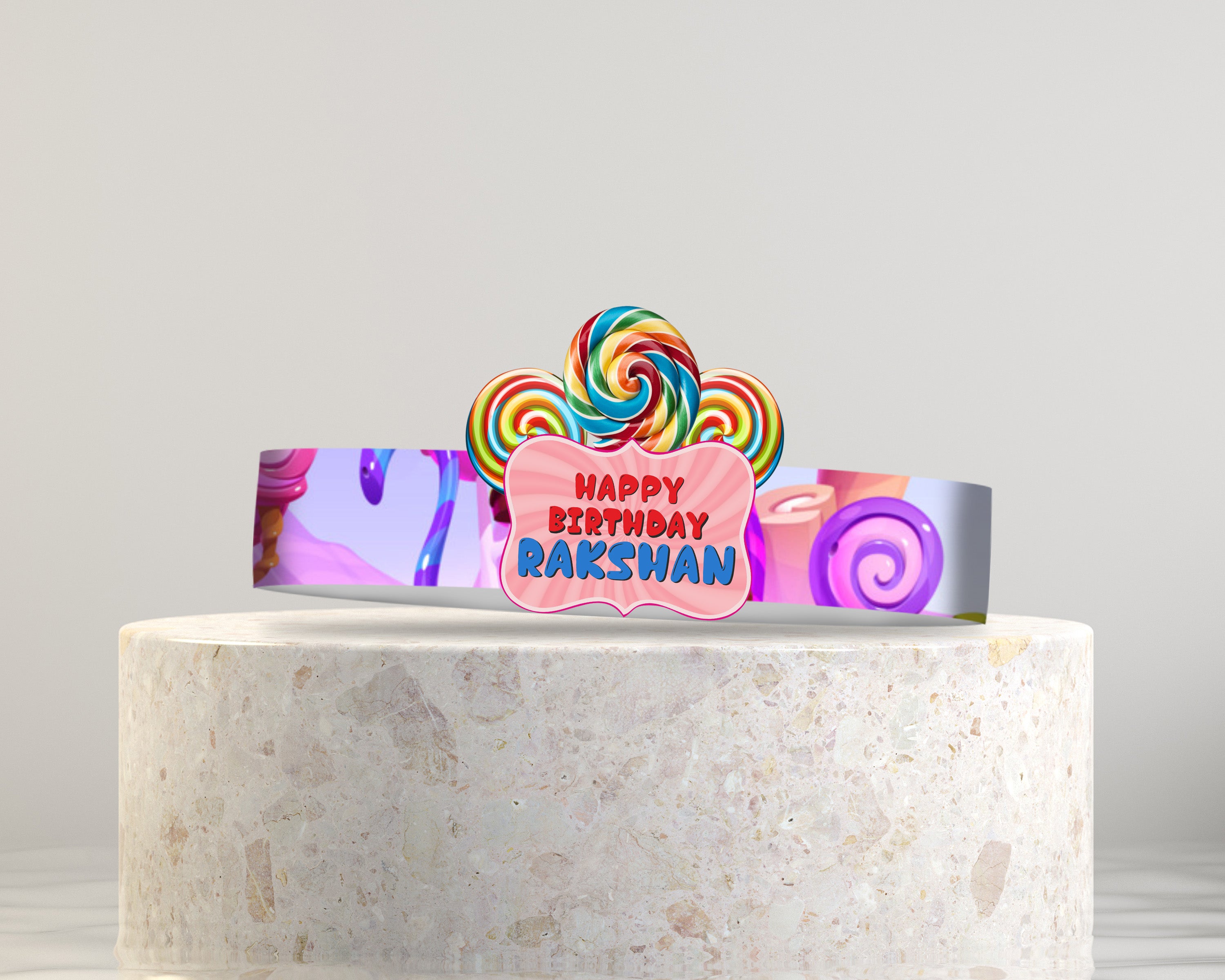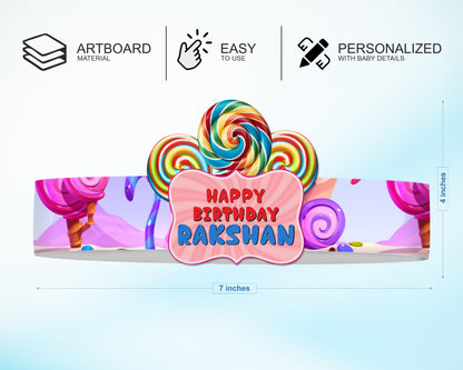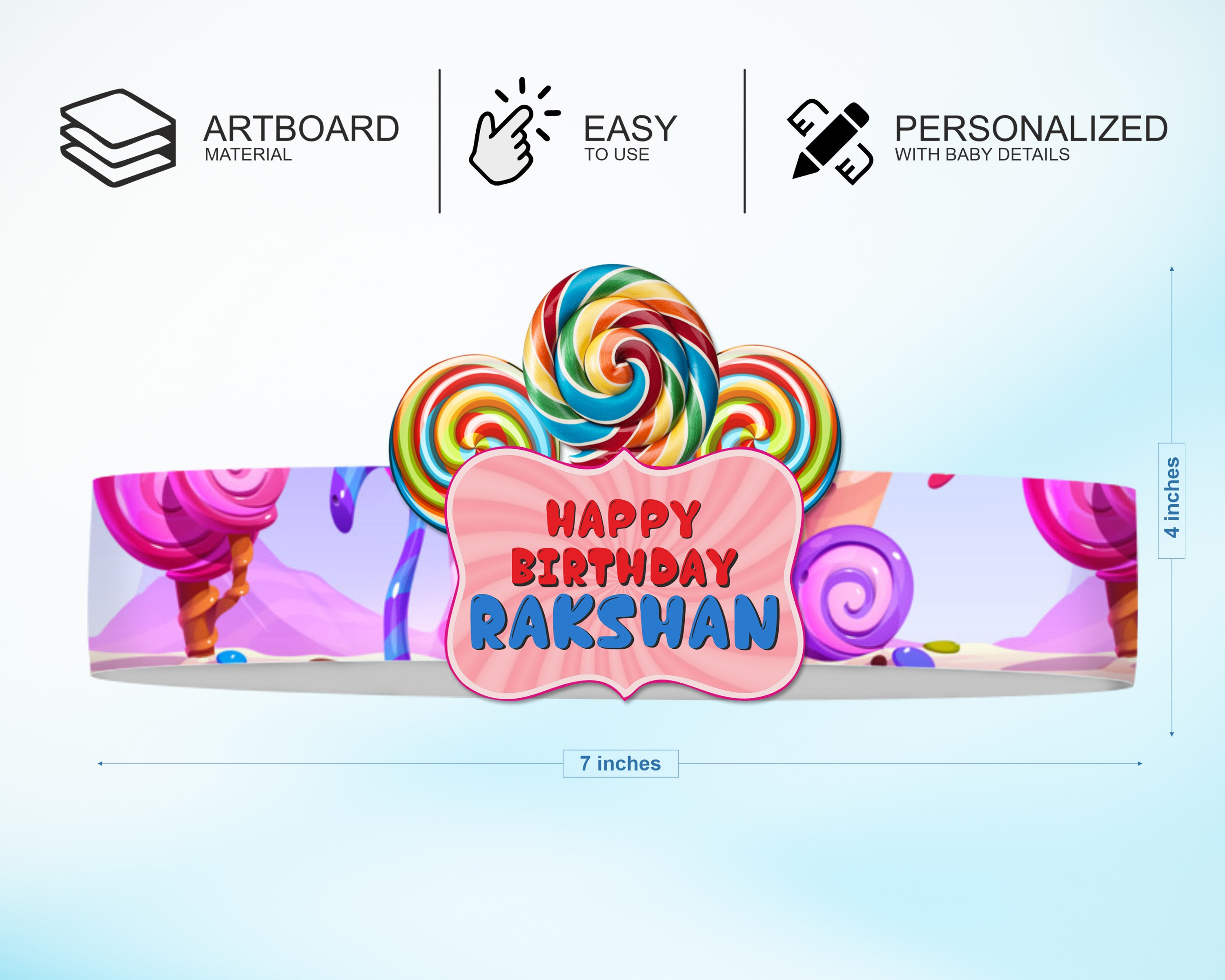 A personalized crown hat based on the Candy theme, made of thick paperboard material, is ideal for celebrating kids' birthday parties.