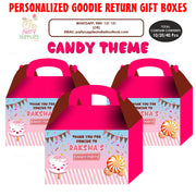 Colorful and Candy theme based Goodie return gift boxes personalized with baby name for take away gifts for guests. Made of 225 GSM quality Art board material to withstand up to 200g to 400g of weight. This boxes can be used to gift items like Chocolates, Cookies, Cup cakes, etc..
