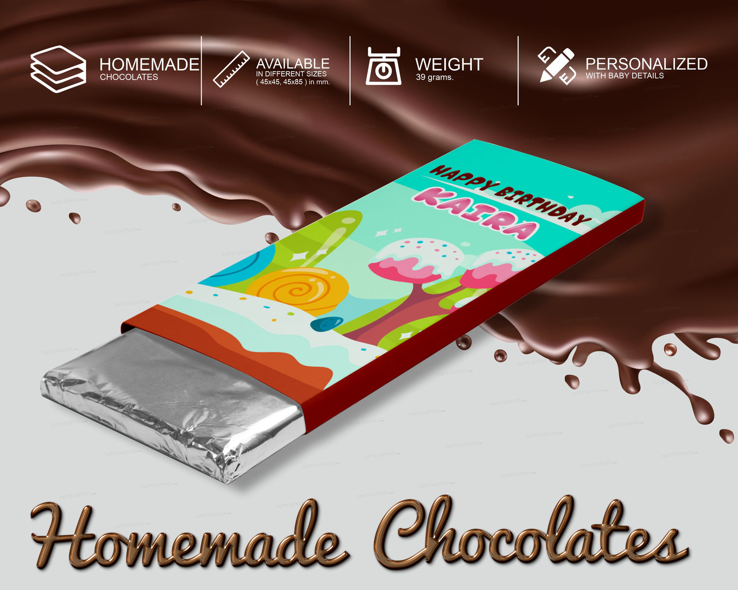 The chocolates are sourced from the finest homemade chocolate makers, and the wrappers are personalized with the baby's name by us, adding a special touch to these sweet treats. Your guests will love receiving