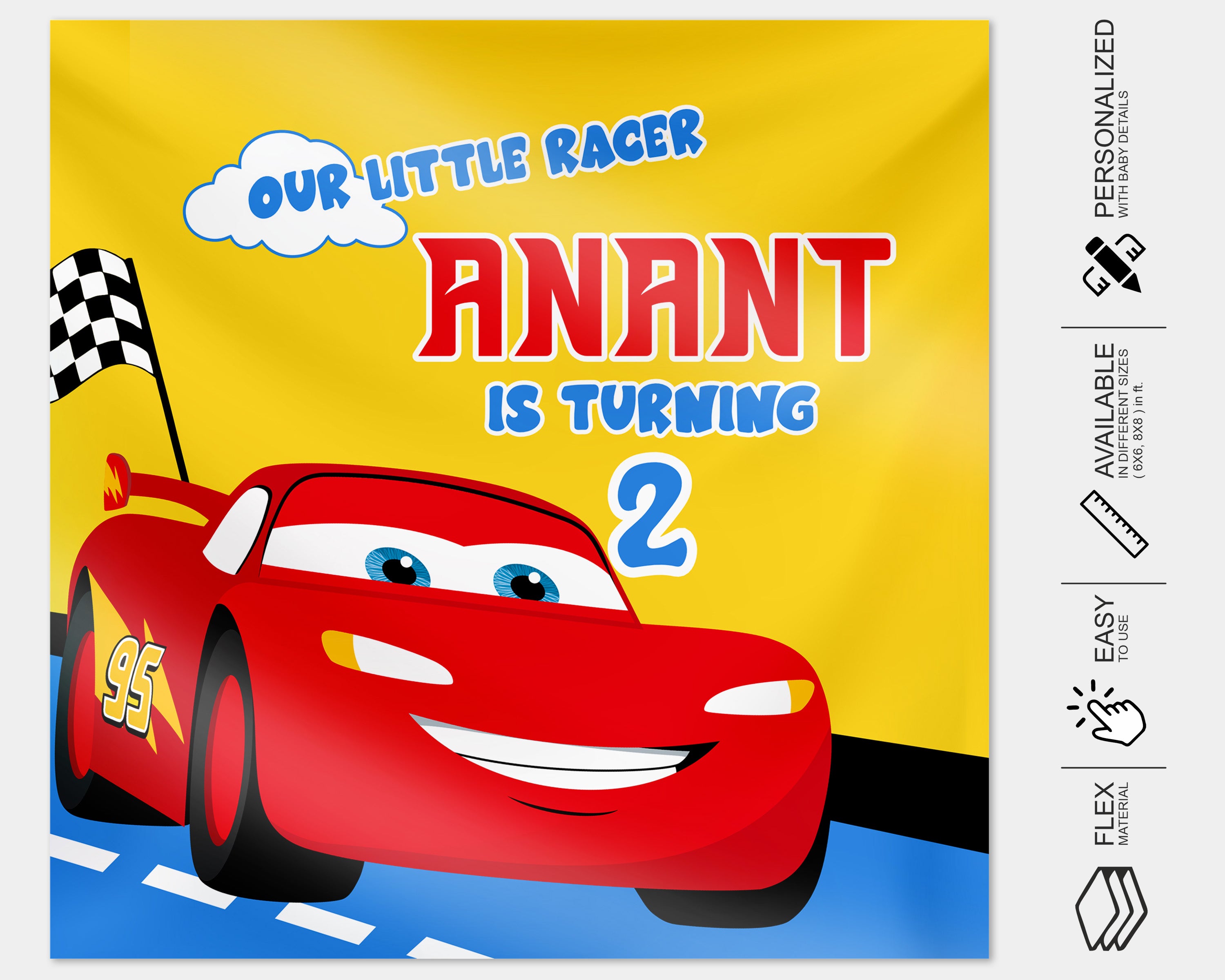 This Car theme based Square Backdrop can be personalized with your baby details. You can share the baby details in form provided below. It comes with different variant sizes.