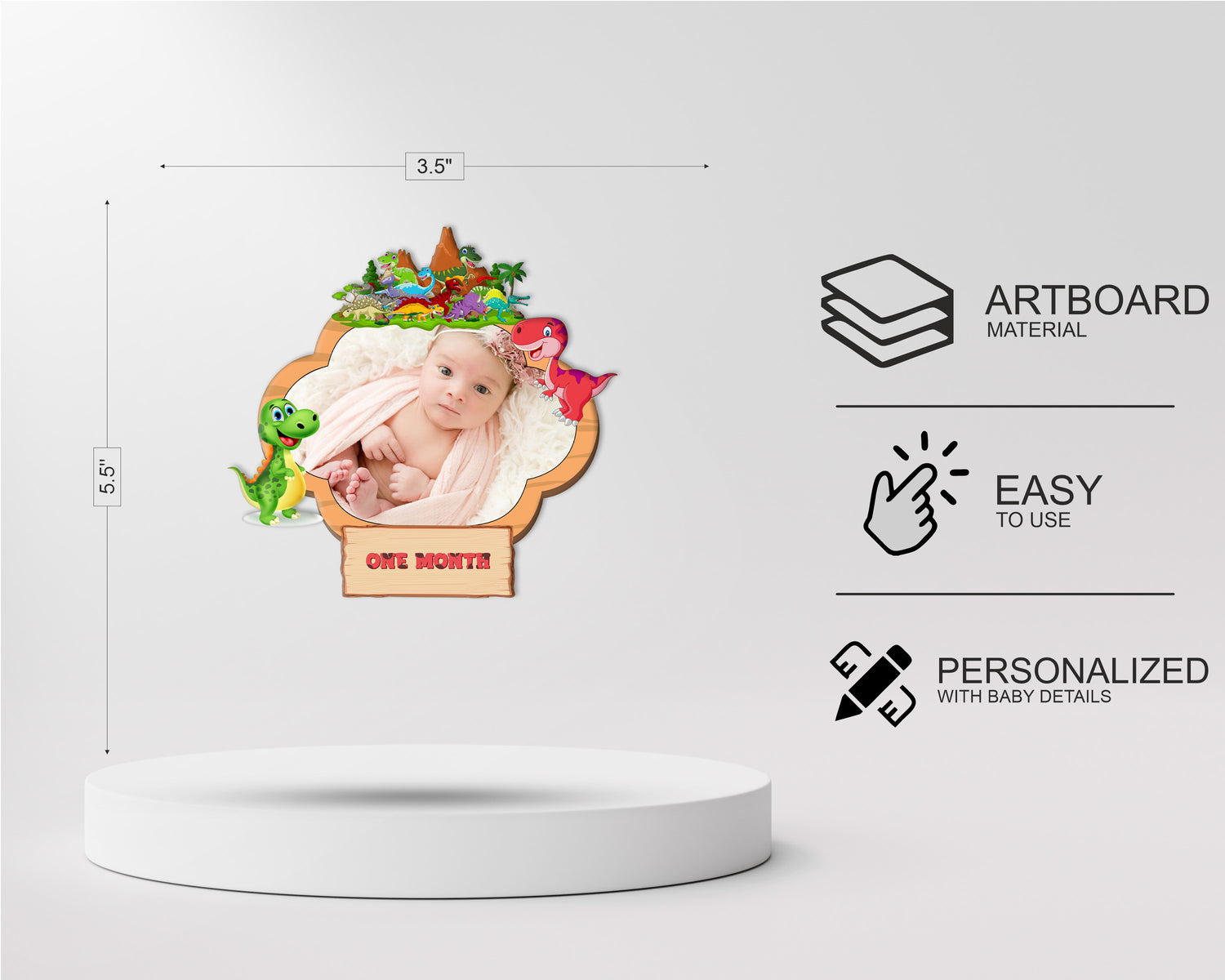 The Dinosaur theme based photo banner is perfect decoration for baby's 1st birthday party. It’s an eye-catching birthday banner with beautiful color, especially with lovely photos of your baby on it which is a special way to bringing a unforgettable and memorable party. This 12 Months Birthday Banner is made of 225 GSM quality Art board material. This package contains 1 set photo banner with ribbon. Size of each month banner will be 6 inches of width and 9 inches of height.