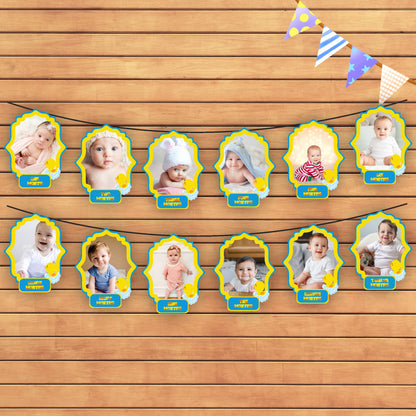 The Duck Boy theme based photo banner is perfect decoration for baby's 1st birthday party. It’s an eye-catching birthday banner with beautiful color, especially with lovely photos of your baby on it which is a special way to bringing a unforgettable and memorable party. This 12 Months Birthday Banner is made of 225 GSM quality Art board material. This package contains 1 set photo banner with ribbon. Size of each month banner will be 6 inches of width and 9 inches of height.