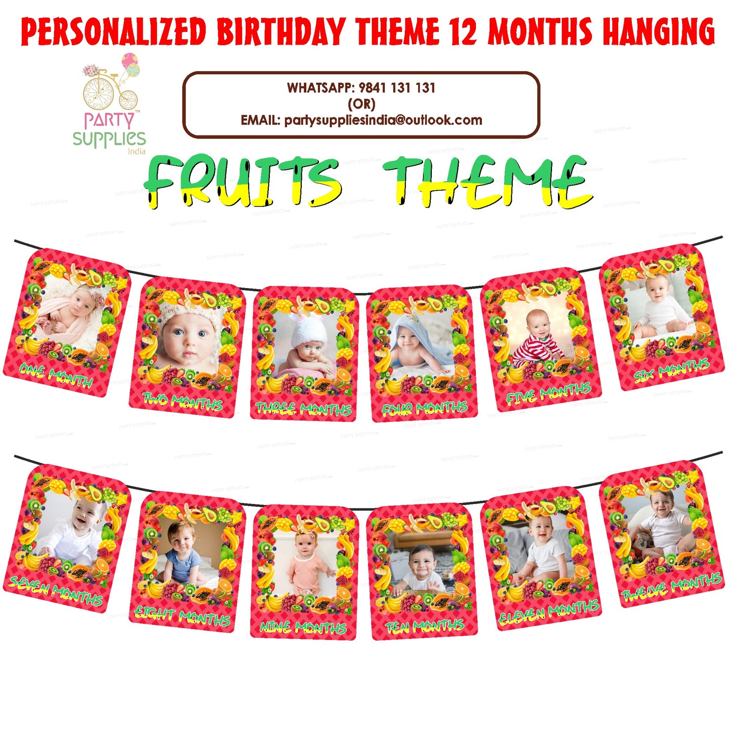 The Fruits theme based photo banner is perfect decoration for baby's 1st birthday party. It’s an eye-catching birthday banner with beautiful color, especially with lovely photos of your baby on it which is a special way to bringing a unforgettable and memorable party. This 12 Months Birthday Banner is made of 225 GSM quality Art board material. This package contains 1 set photo banner with ribbon. Size of each month banner will be 6 inches of width and 9 inches of height.