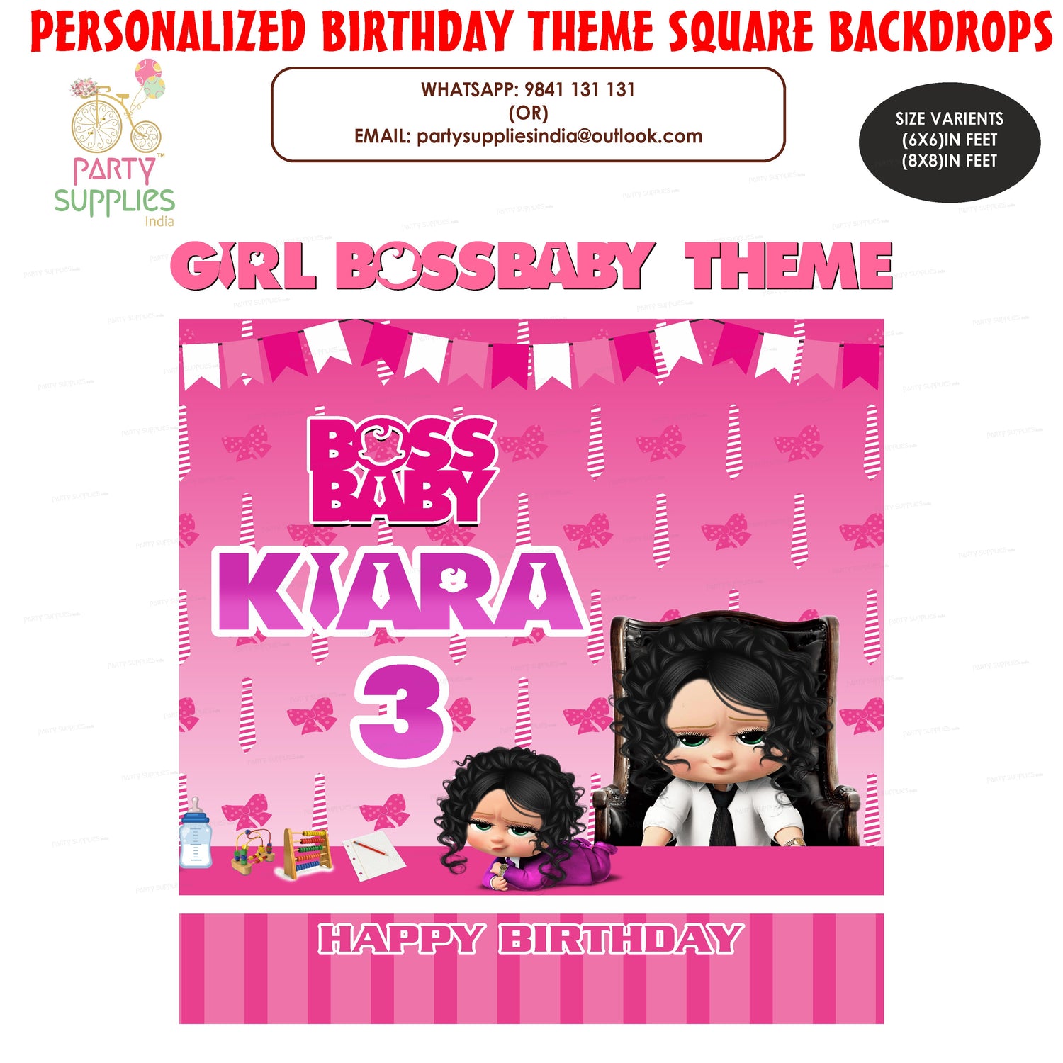 This Girl Boss Baby theme based Square Backdrop can be personalized with your baby details. You can share the baby details in form provided below. It comes with different variant sizes.