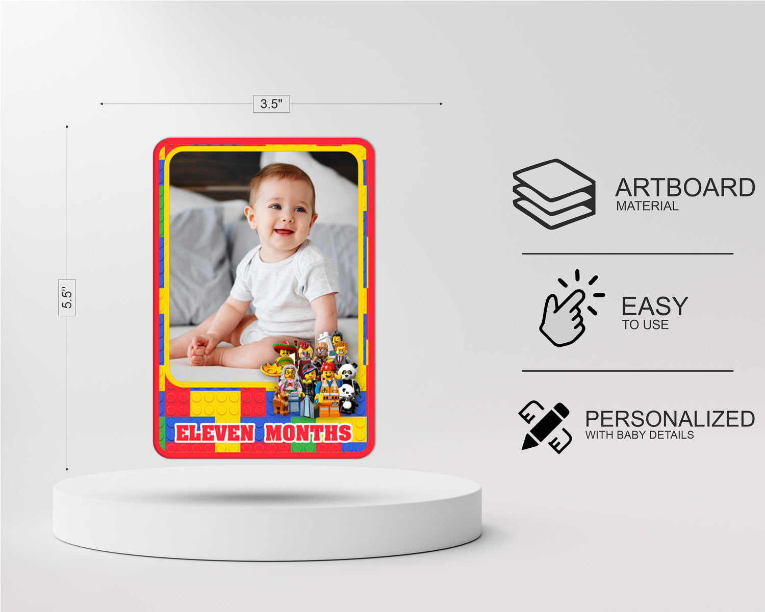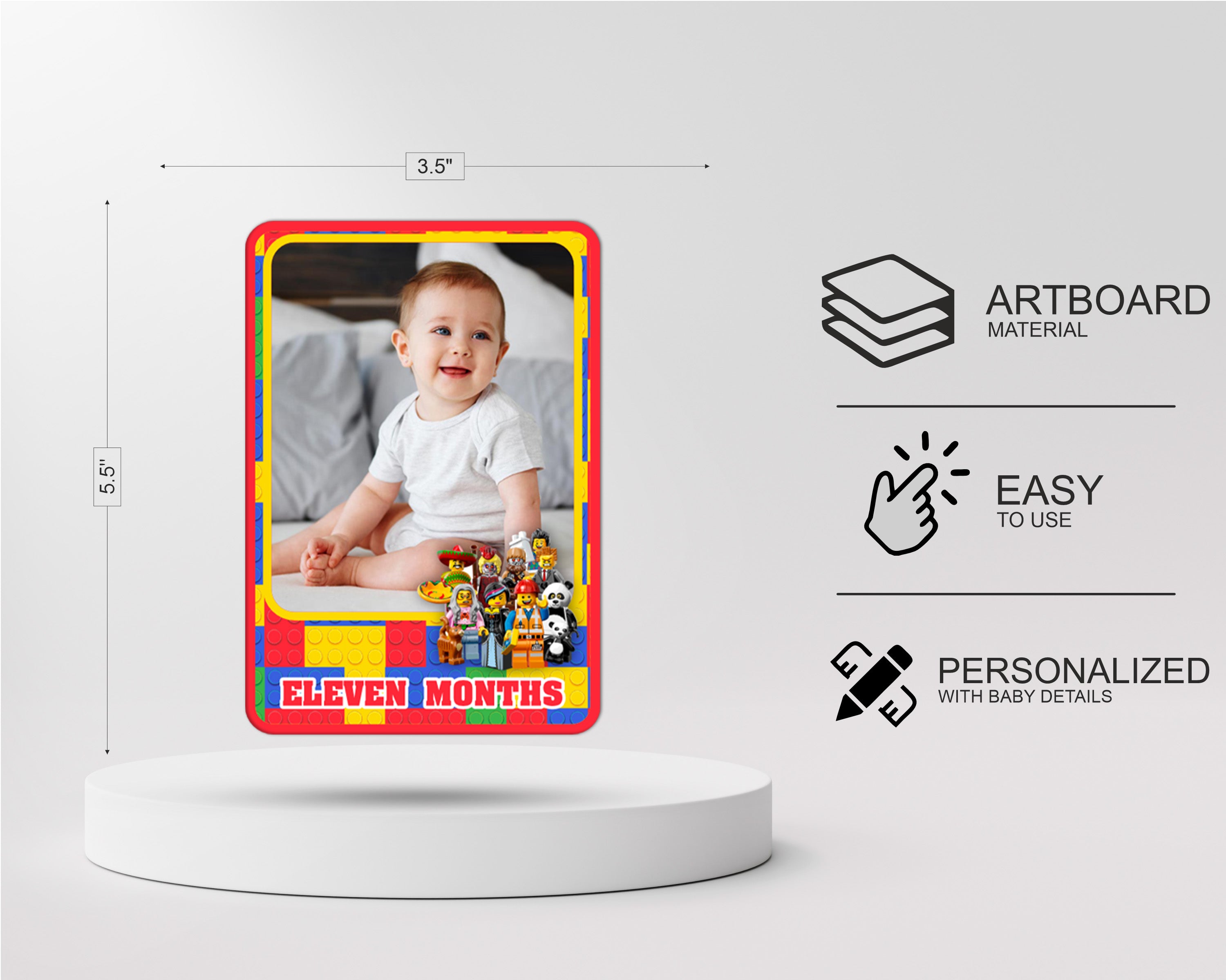 The Lego theme based photo banner is perfect decoration for baby's 1st birthday party. It’s an eye-catching birthday banner with beautiful color, especially with lovely photos of your baby on it which is a special way to bringing a unforgettable and memorable party. This 12 Months Birthday Banner is made of 225 GSM quality Art board material. This package contains 1 set photo banner with ribbon. Size of each month banner will be 6 inches of width and 9 inches of height.