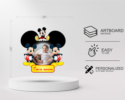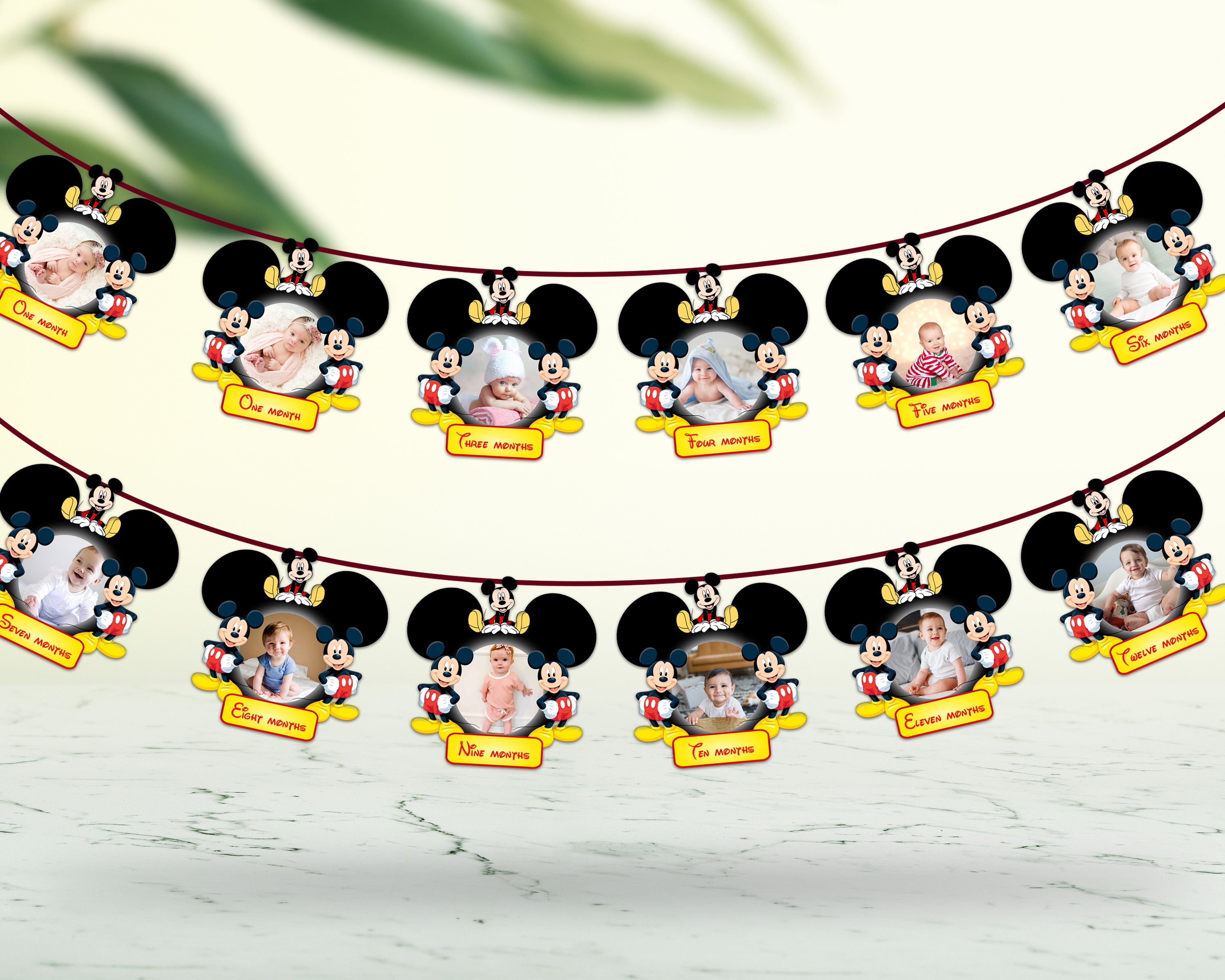 The Mickey Mouse theme based photo banner is perfect decoration for baby's 1st birthday party. It’s an eye-catching birthday banner with beautiful color, especially with lovely photos of your baby on it which is a special way to bringing a unforgettable and memorable party. This 12 Months Birthday Banner is made of 225 GSM quality Art board material. This package contains 1 set photo banner with ribbon. Size of each month banner will be 6 inches of width and 9 inches of height.