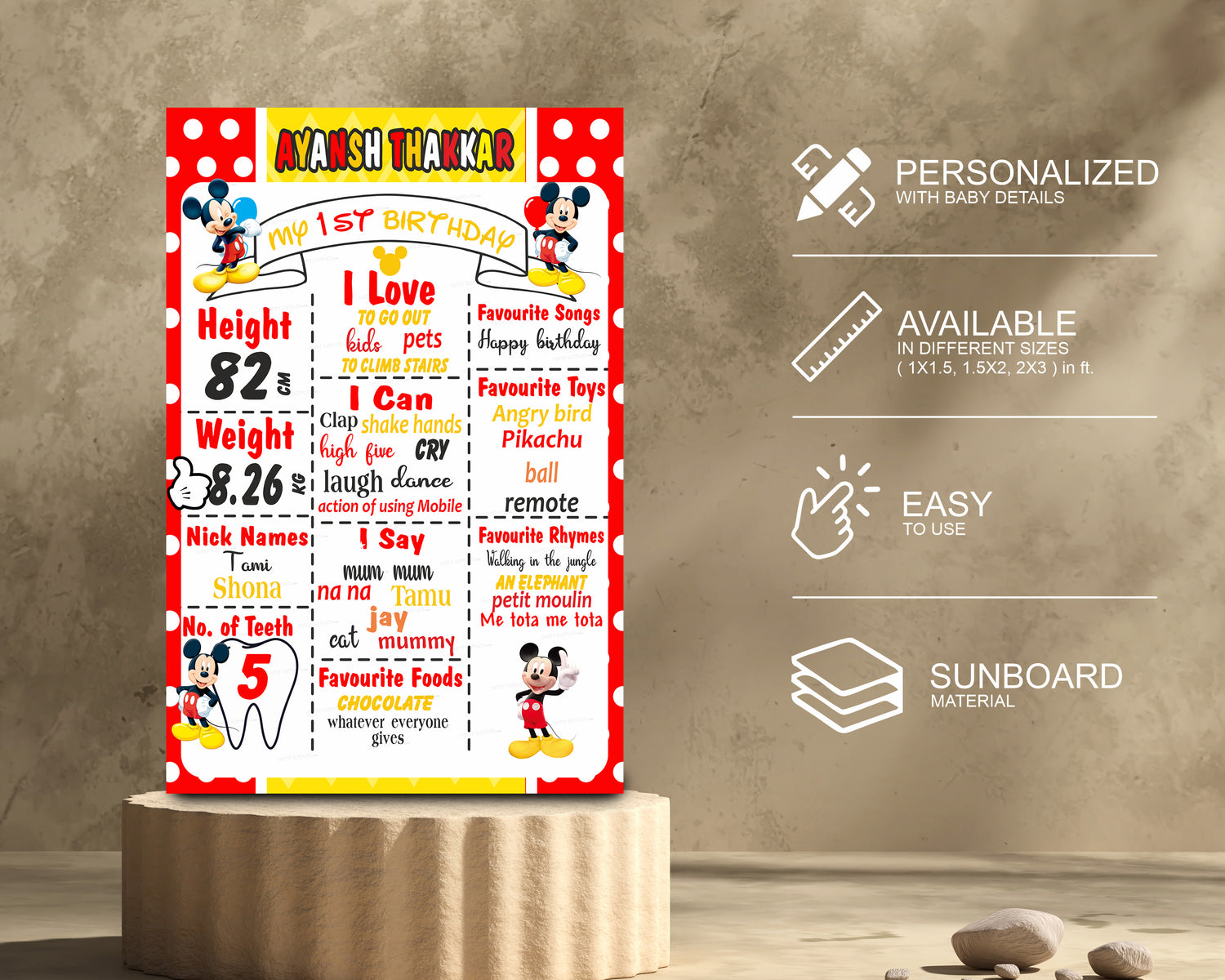 Chalk Board is a great way of cherishing the baby's likes, the milestones in their growth. A Chalk board would be a gift for your kid forever. Based on the Mickey Mouse theme, you can help us customize it with Baby details.