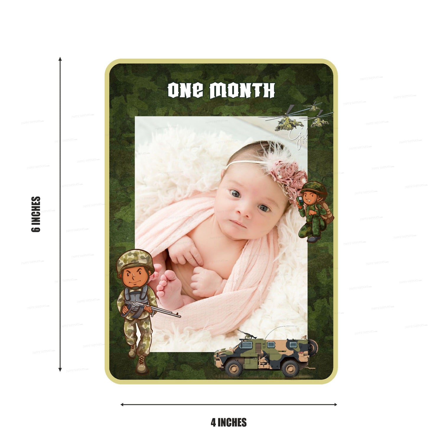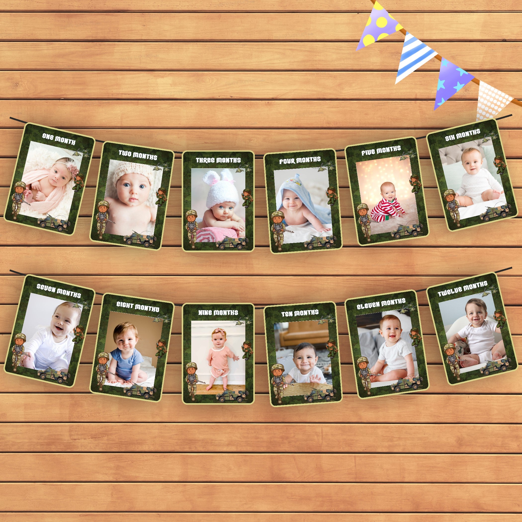 The Military theme based photo banner is perfect decoration for baby's 1st birthday party. It’s an eye-catching birthday banner with beautiful color, especially with lovely photos of your baby on it which is a special way to bringing a unforgettable and memorable party. This 12 Months Birthday Banner is made of 225 GSM quality Art board material. This package contains 1 set photo banner with ribbon. Size of each month banner will be 6 inches of width and 9 inches of height.
