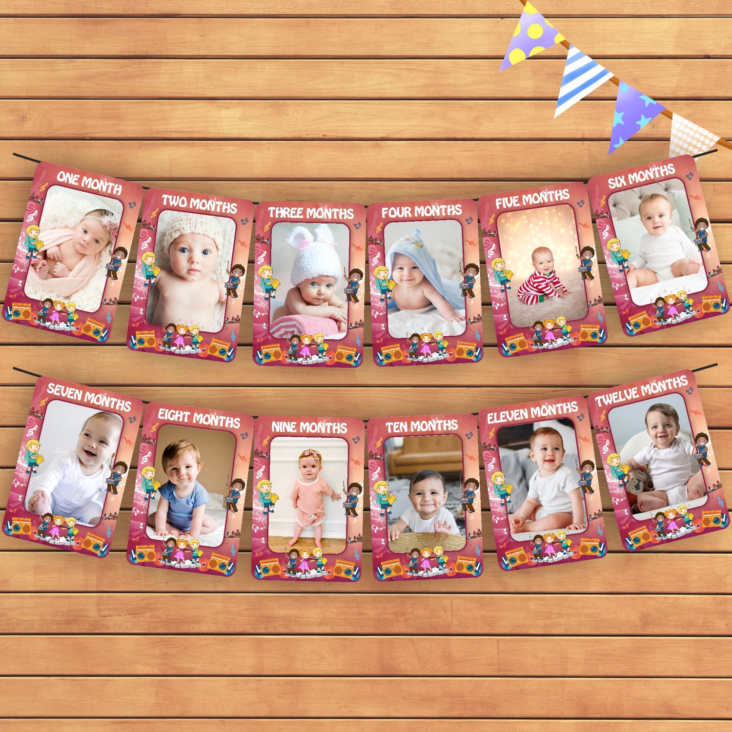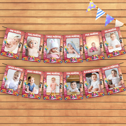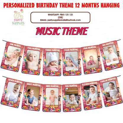 The Music theme based photo banner is perfect decoration for baby's 1st birthday party. It’s an eye-catching birthday banner with beautiful color, especially with lovely photos of your baby on it which is a special way to bringing a unforgettable and memorable party. This 12 Months Birthday Banner is made of 225 GSM quality Art board material. This package contains 1 set photo banner with ribbon. Size of each month banner will be 6 inches of width and 9 inches of height.