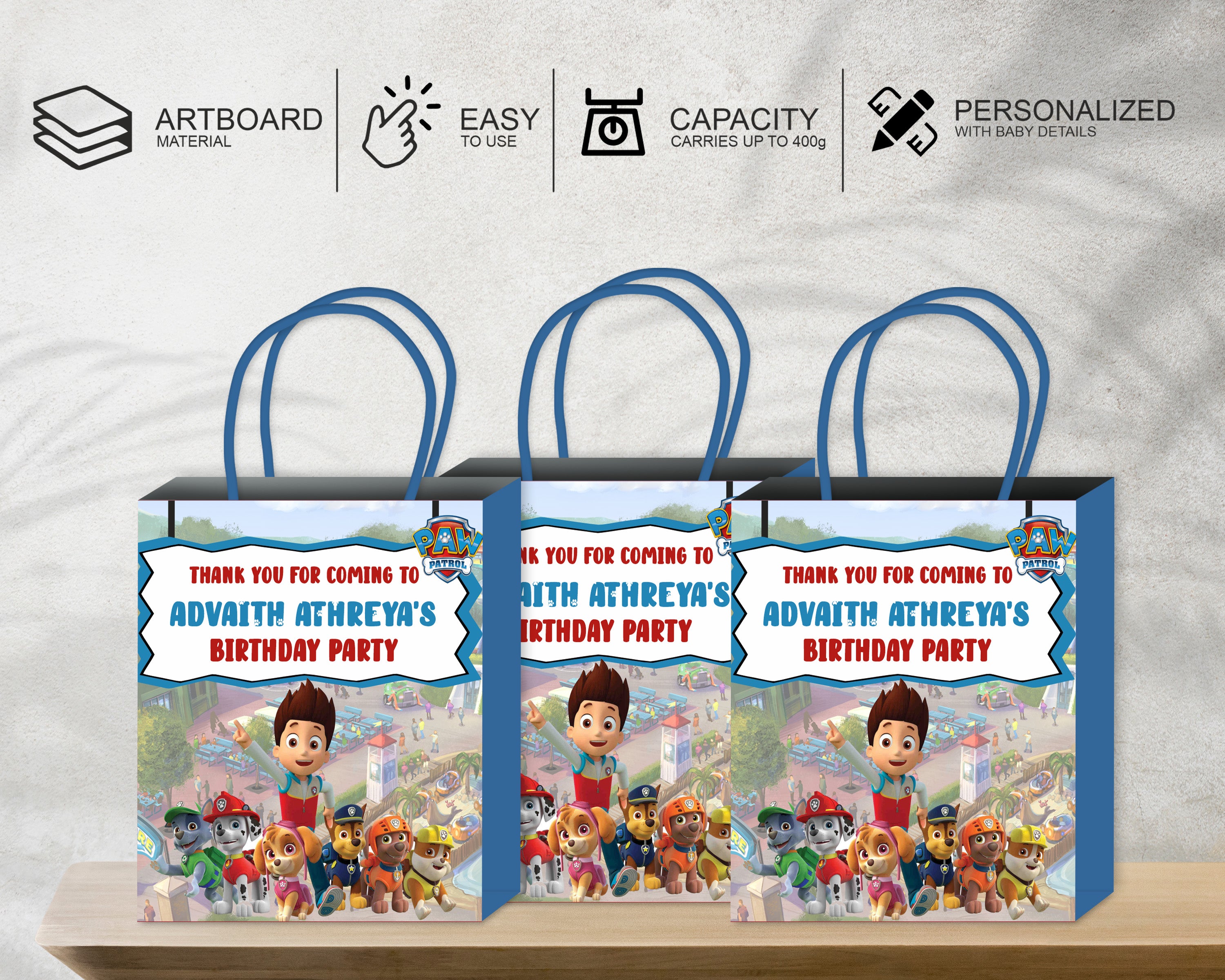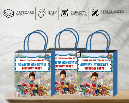Colorful and Paw Patrol theme based return gift bag personalized with baby name for take away gifts for guests. Made of 225 GSM quality Art board material and it can withstand upto 400g to 600g of weight also will have satin ribbon at the top to hold it (Colour of satin ribbon will be based on availability).