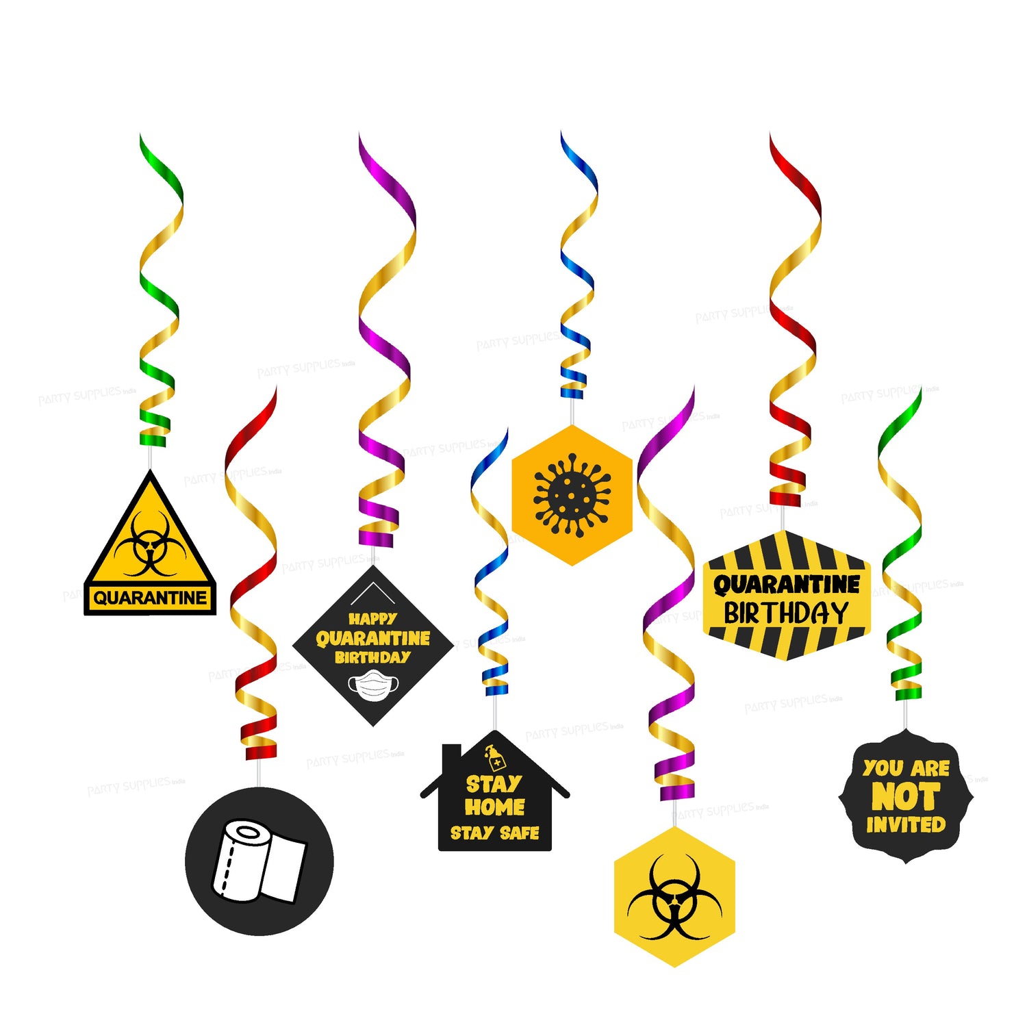 Decorate the ceiling and raise the roof! These Quarantine Zone Swirl Decorations are perfect decorations for your child's birthday. Featuring black and yellow swirls with cardstock attachments like quarantine signs and symbols, these hanging decorations will get the whole crew ready to party. Hang them by the attached strings to build up the excitement!