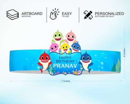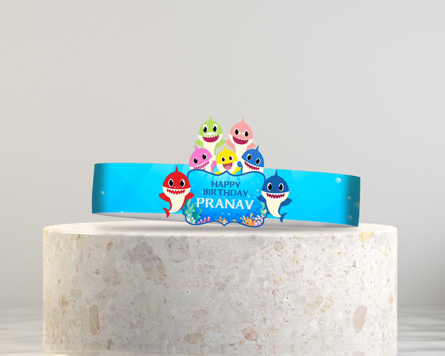 A personalized crown hat based on the Shark Boy theme, made of thick paperboard material, is ideal for celebrating kids' birthday parties.