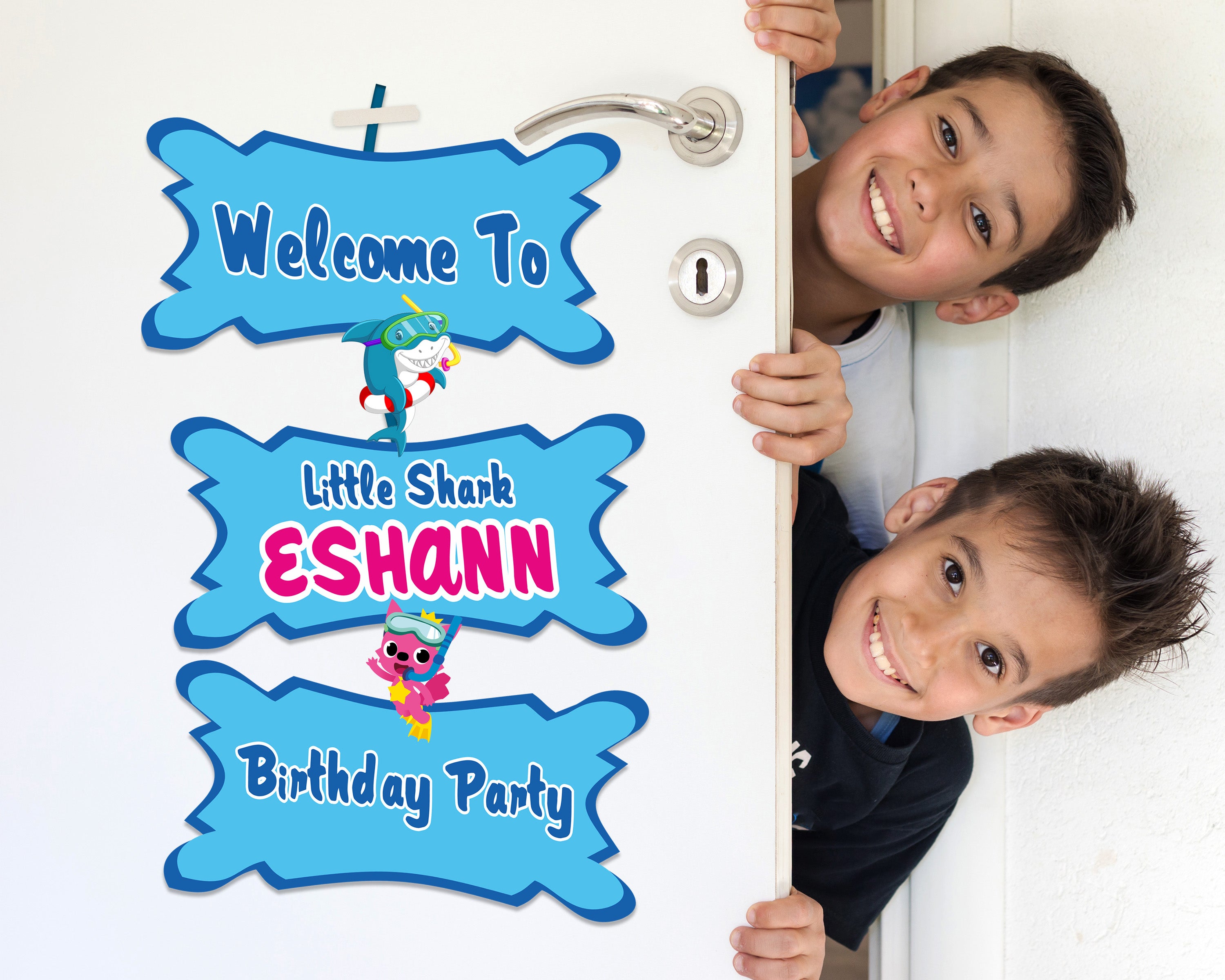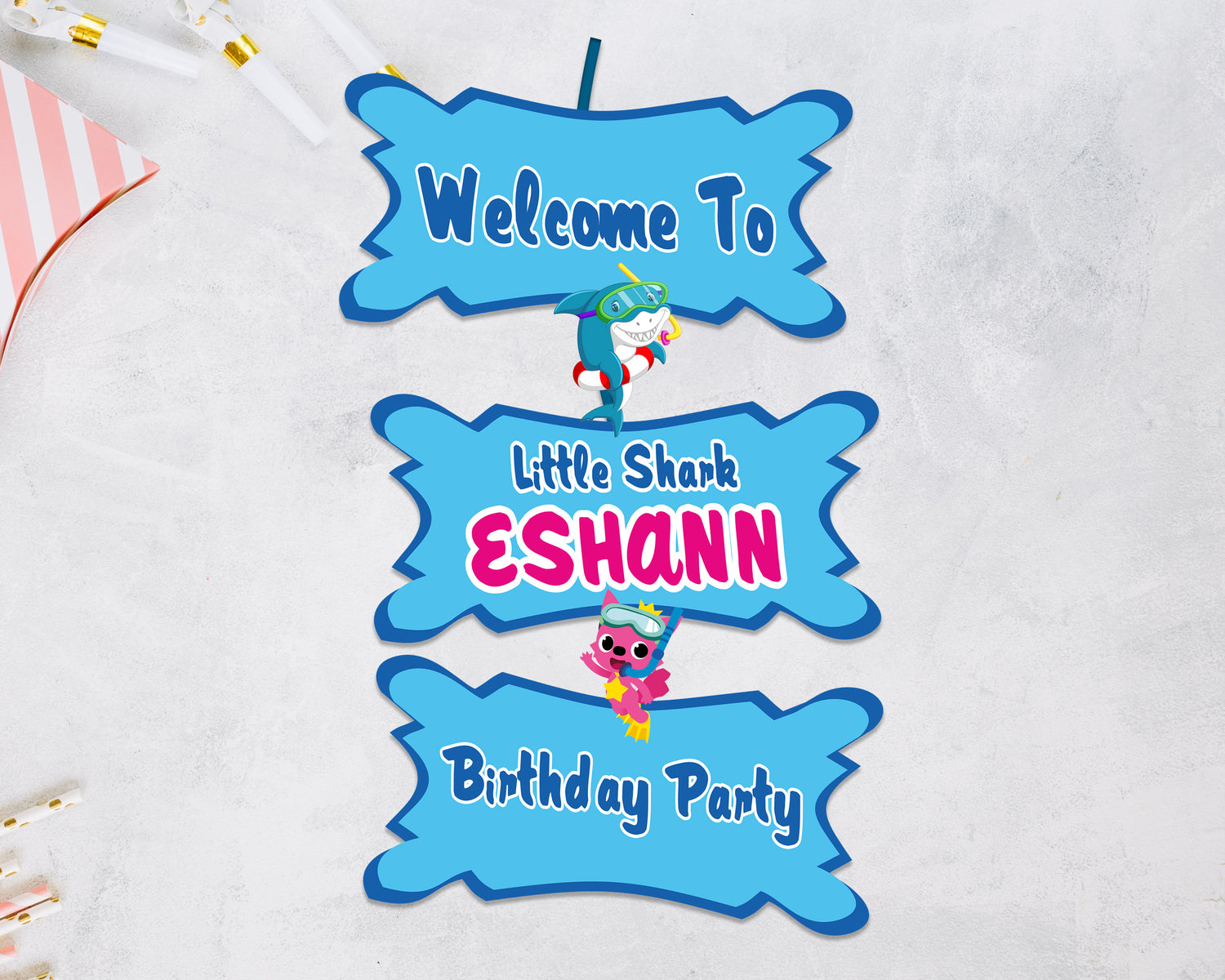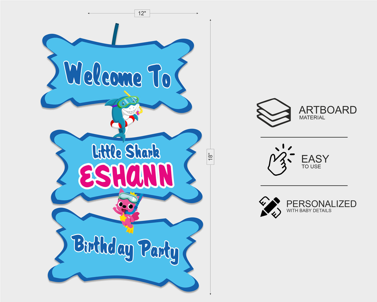 Begin styling a playful fun filled Shark party when you choose a Welcome Board! The vivid colors and fun design will greet all of your party guests as they enter. Personalize with the name and age.