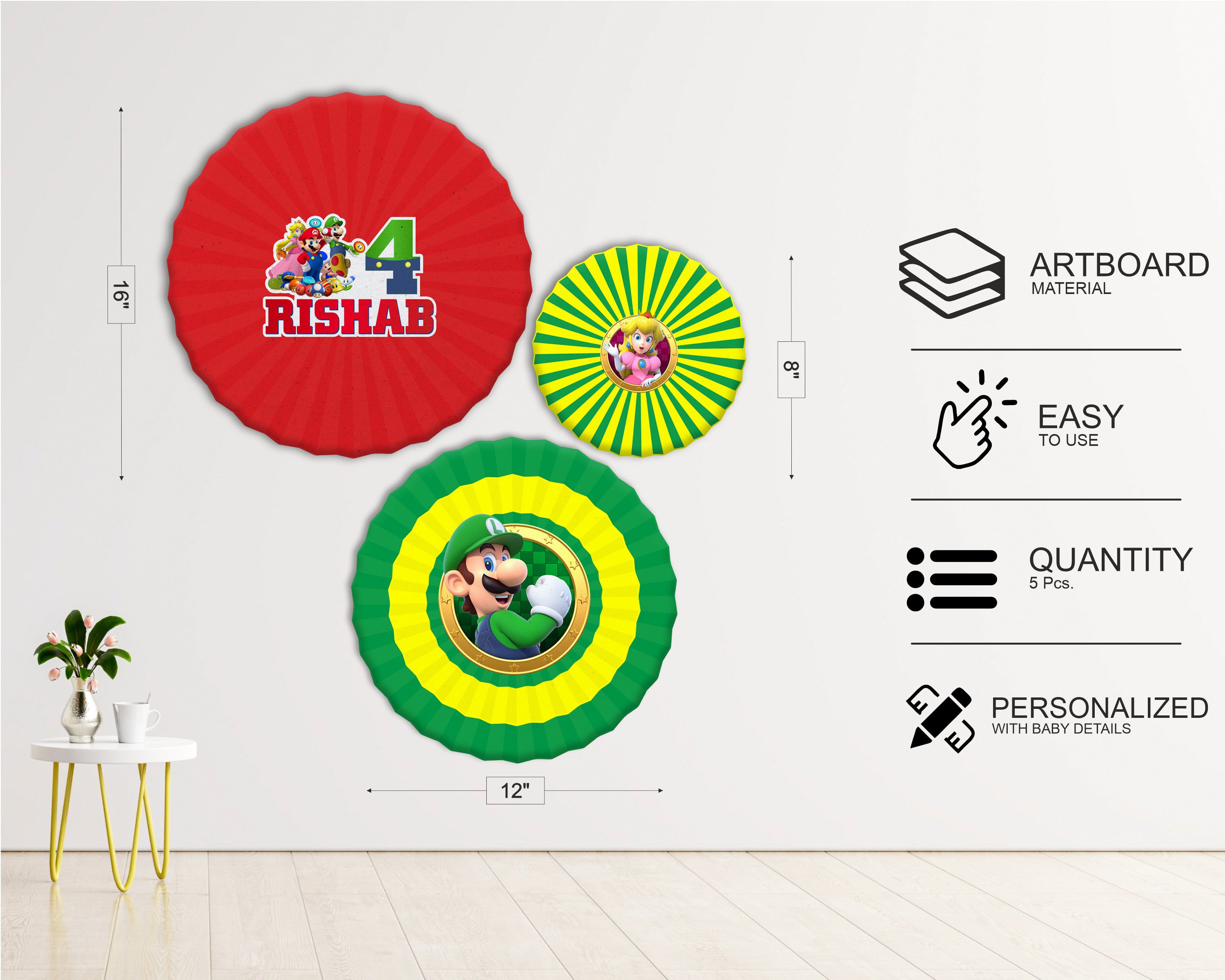 Super Mario Theme Based Paper Fan with related characters placed at the centre which is mainly used for Birthday Party Decorations and made of quality chart material.
