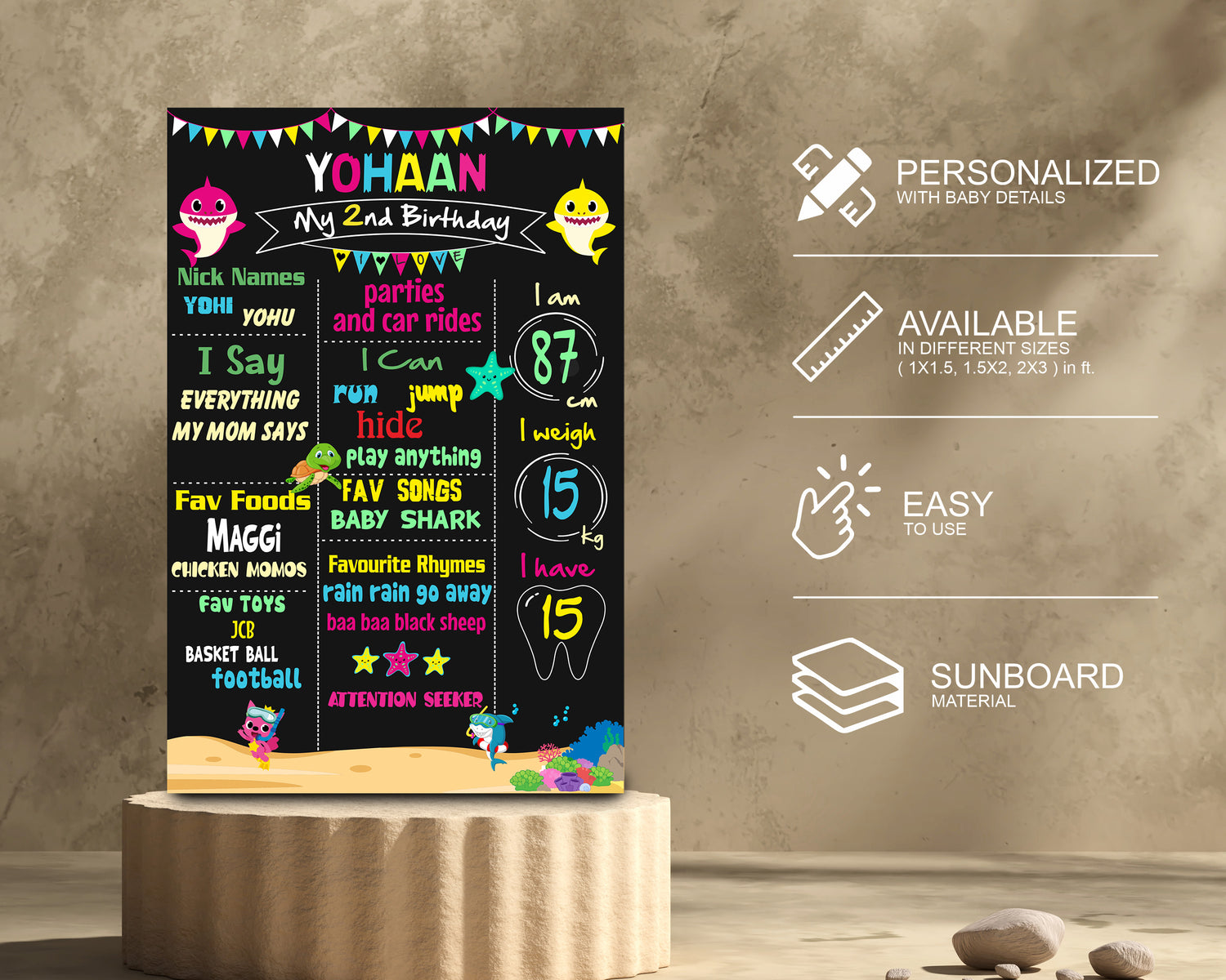 Chalk Board is a great way of cherishing the baby's likes, the milestones in their growth. A Chalk board would be a gift for your kid forever. Based on the Shark theme, you can help us customize it with fine details. You can also choose the pictures .