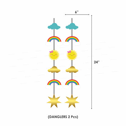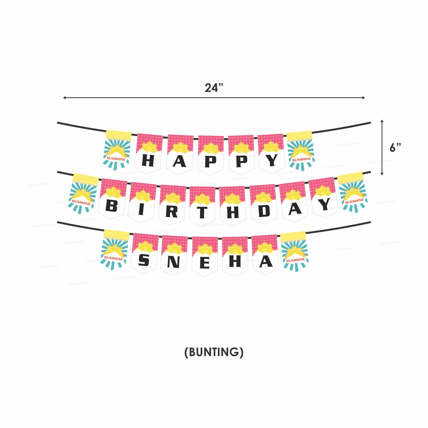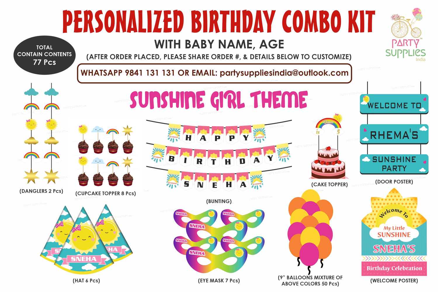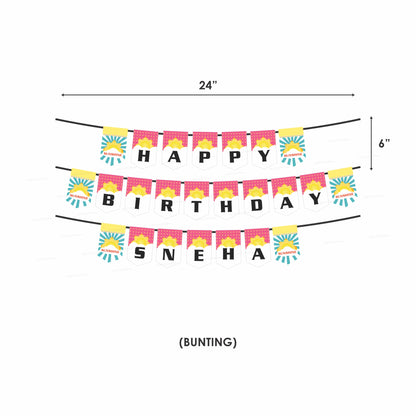 Although the delightful Sunshine theme would brighten any day, use it to brighten everyone’s mood on your kids' birthday! You are My Sunshine is a perfect gender neutral theme choice and lent's itself to loads of sunny details incorporated into decorations with personalization. A color palette doesn’t get more neutral than yellow and the bright sun. Fun, clean, cheerful and modern, these colors provided the starting point for a sophisticated celebration. A flex backdrop and color coordinating ribbon bunting, will be accented with custom banners and a framed print of a shining sun. Preferred Kit is Available for Sunshine Girl Theme.