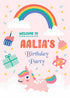 Set the foundation for a magical birthday party with the Unicorn Welcome Board! This board features a colorful rainbow, the background and colorful images of a unicorn ,gifts, cakes and confetti. Personalise it with your kid's name.